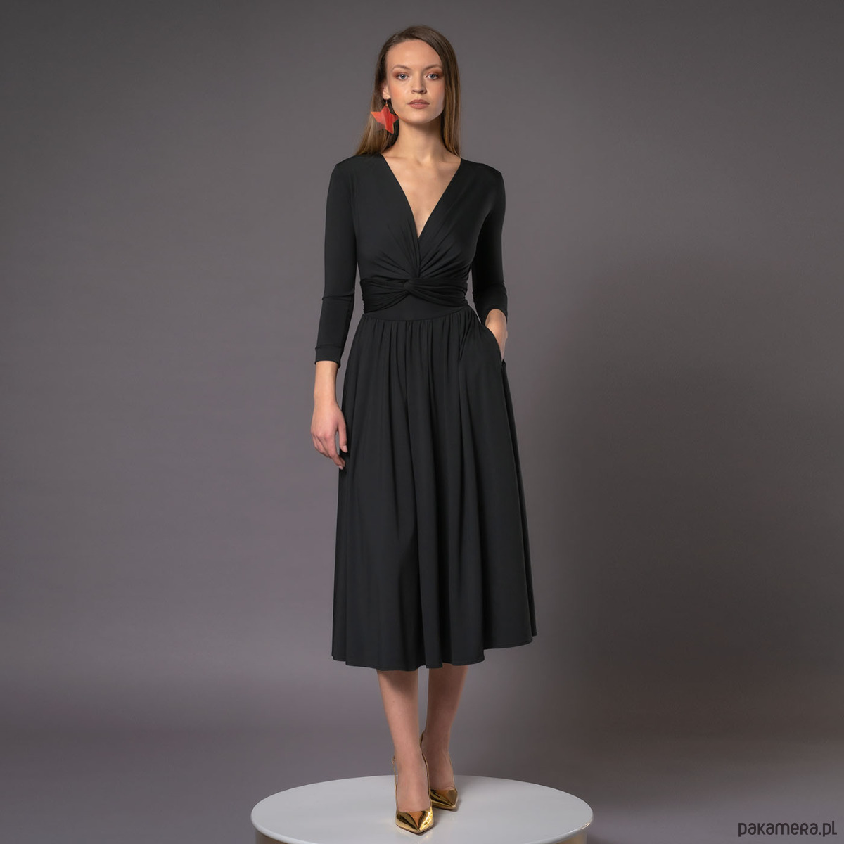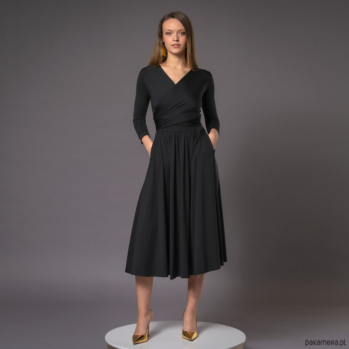 Dół sukienki jest rozkloszowany, długości 7/8 długości, a kieszenie ukryte w bocznych szwach dodają jej praktycznego charakteru. Rękaw kończy się w okolicach łokcia, a całość pięknie wysmukla sylwetkę i zapewnia pełen komfort noszenia.
