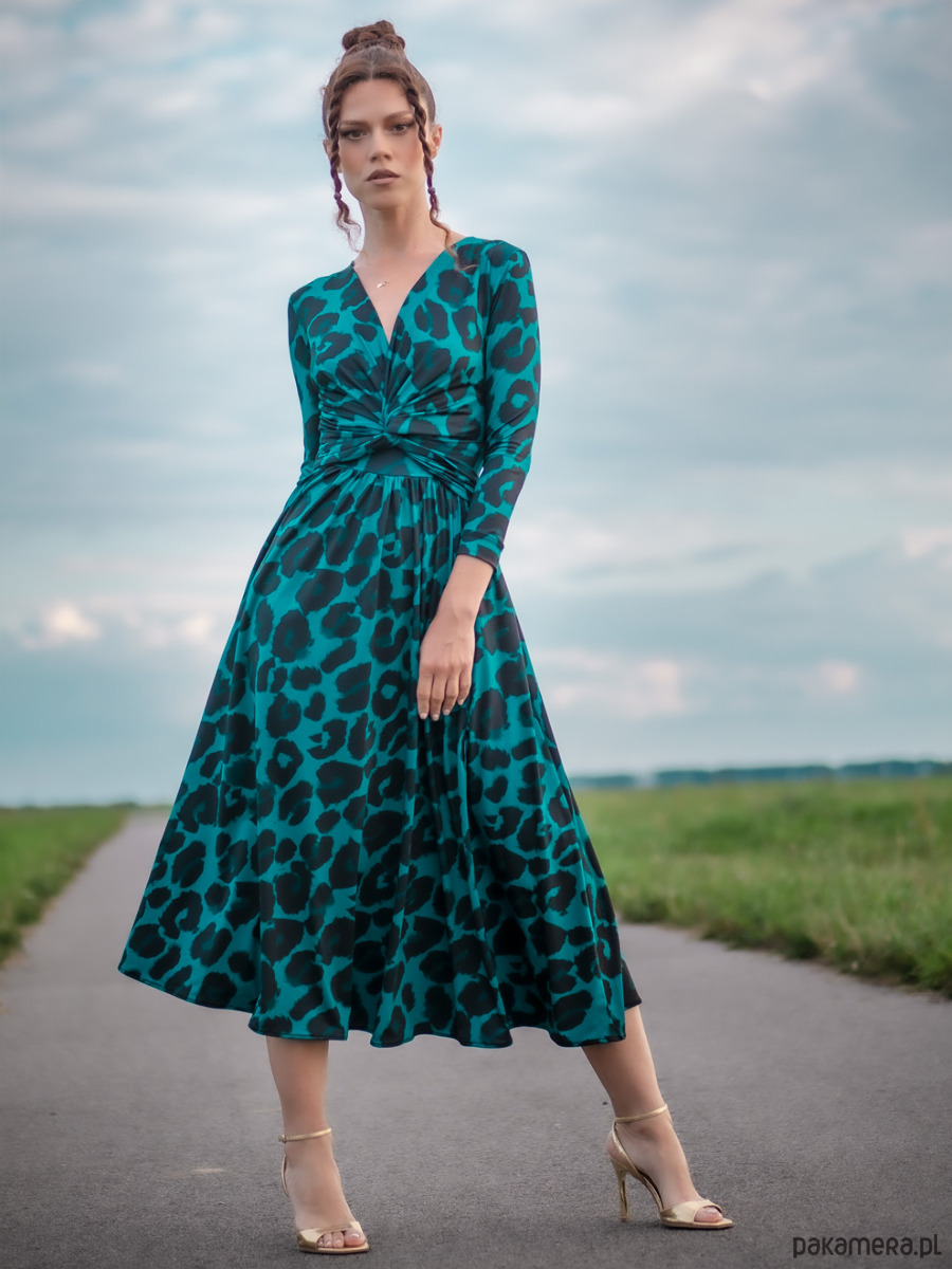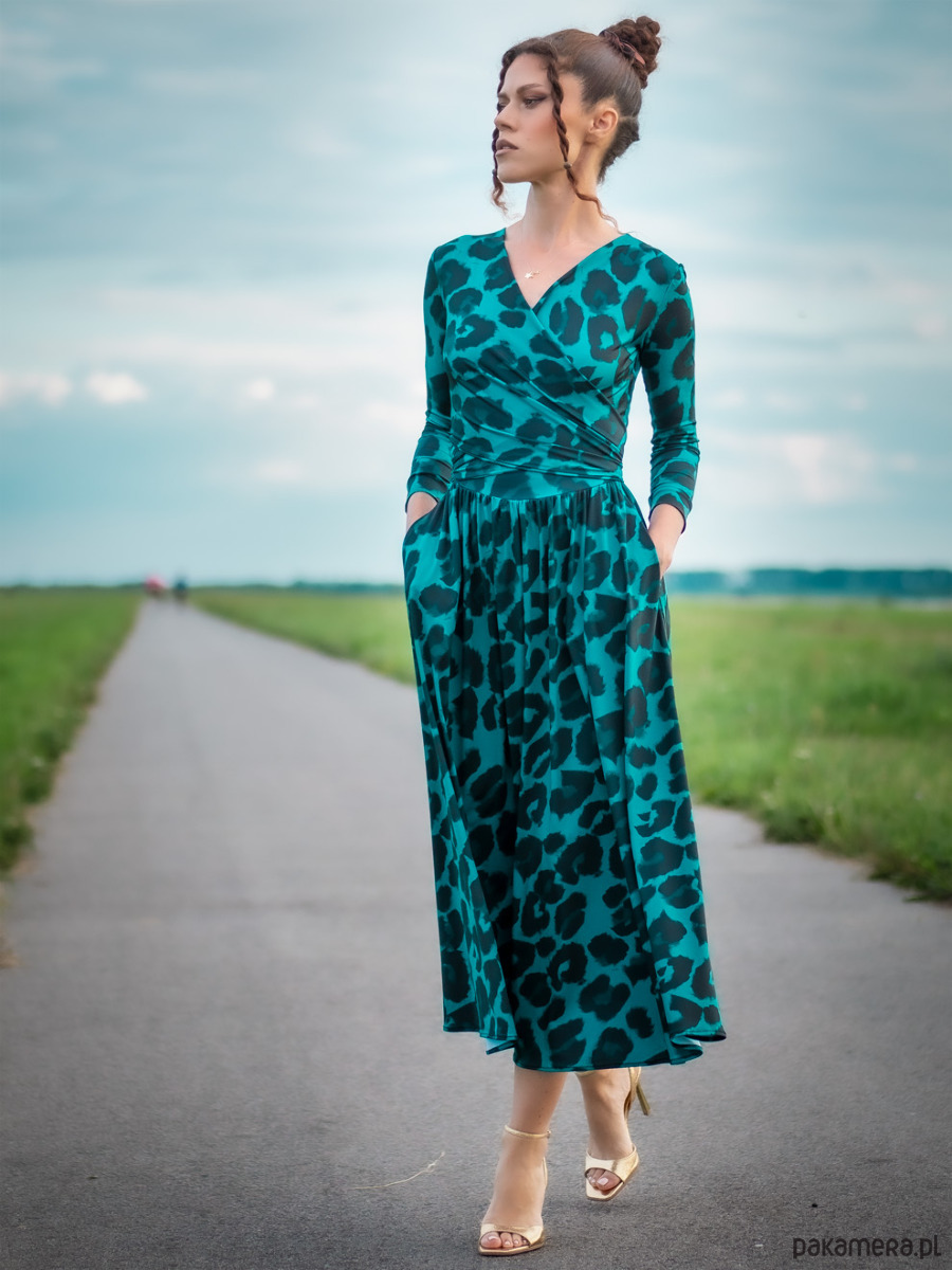 Dół sukienki jest rozkloszowany, długości 7/8 długości, a kieszenie ukryte w bocznych szwach dodają jej praktycznego charakteru. Rękaw kończy się w okolicach łokcia, a całość pięknie wysmukla sylwetkę i zapewnia pełen komfort noszenia.