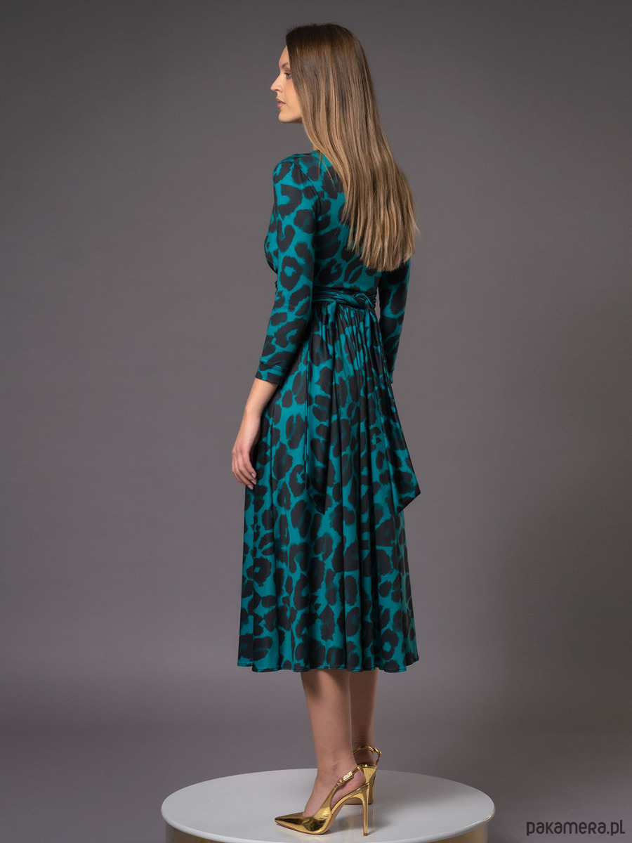 Dół sukienki jest rozkloszowany, długości 7/8 długości, a kieszenie ukryte w bocznych szwach dodają jej praktycznego charakteru. Rękaw kończy się w okolicach łokcia, a całość pięknie wysmukla sylwetkę i zapewnia pełen komfort noszenia.