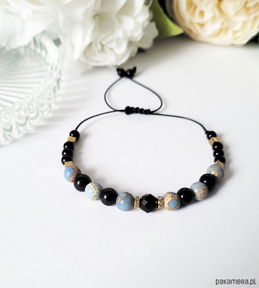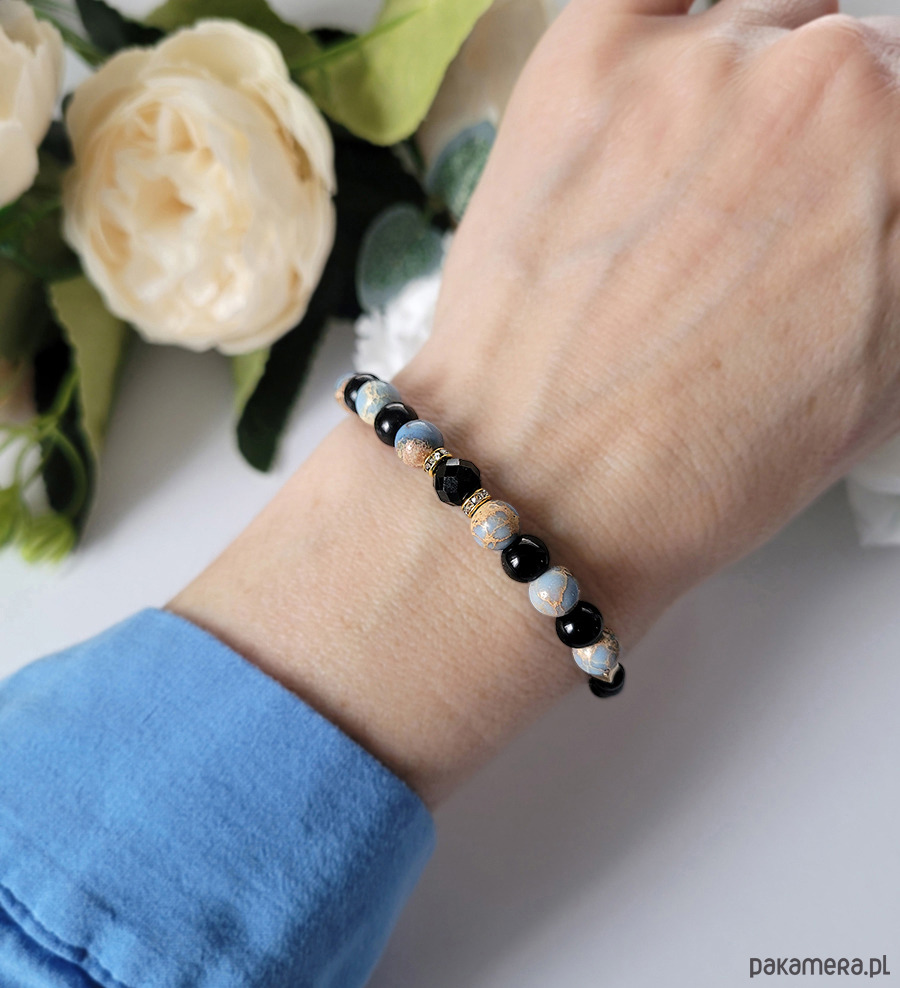 Przepiękna bransoletka z kolekcji "Queen of dark z turmalinem" zrobiona z kamieni naturalnych: Turmalinu, Onyksu, Jaspisu cesarskiego oraz Hematytu w kolorze złota.
