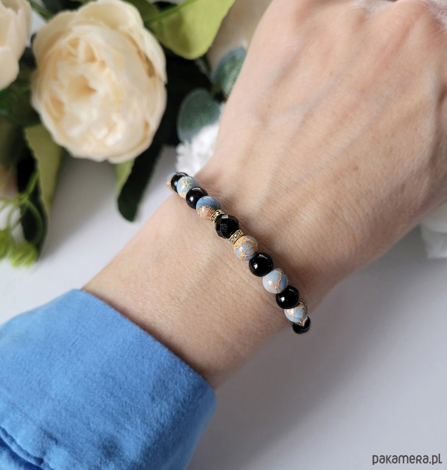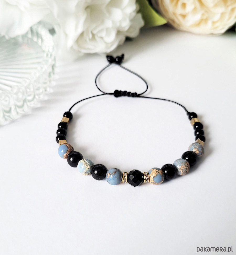 Przepiękna bransoletka z kolekcji "Queen of dark z turmalinem" zrobiona z kamieni naturalnych: Turmalinu, Onyksu, Jaspisu cesarskiego oraz Hematytu w kolorze złota.