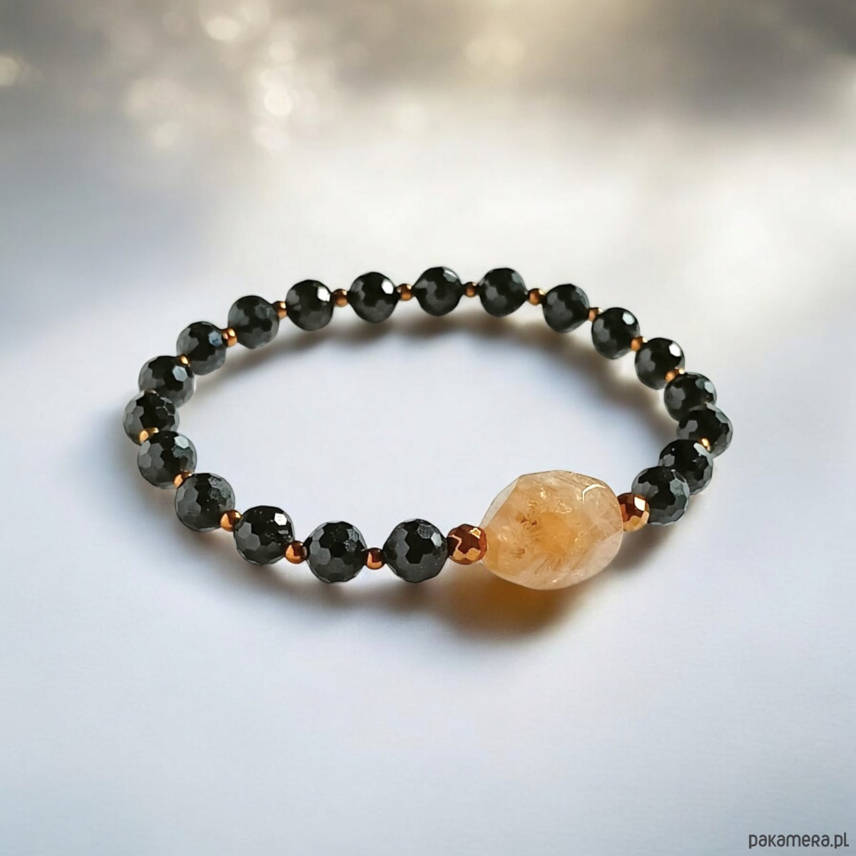 Bransoletka wykonana z wykonana z nieregularnej, ciosanej i polerowanej bryłki cytrynu (ok. 14mm), fasetowanych kuleczek czarnego turmalinu (ok.6,5mm) i przekładek ze złotego hematytu.