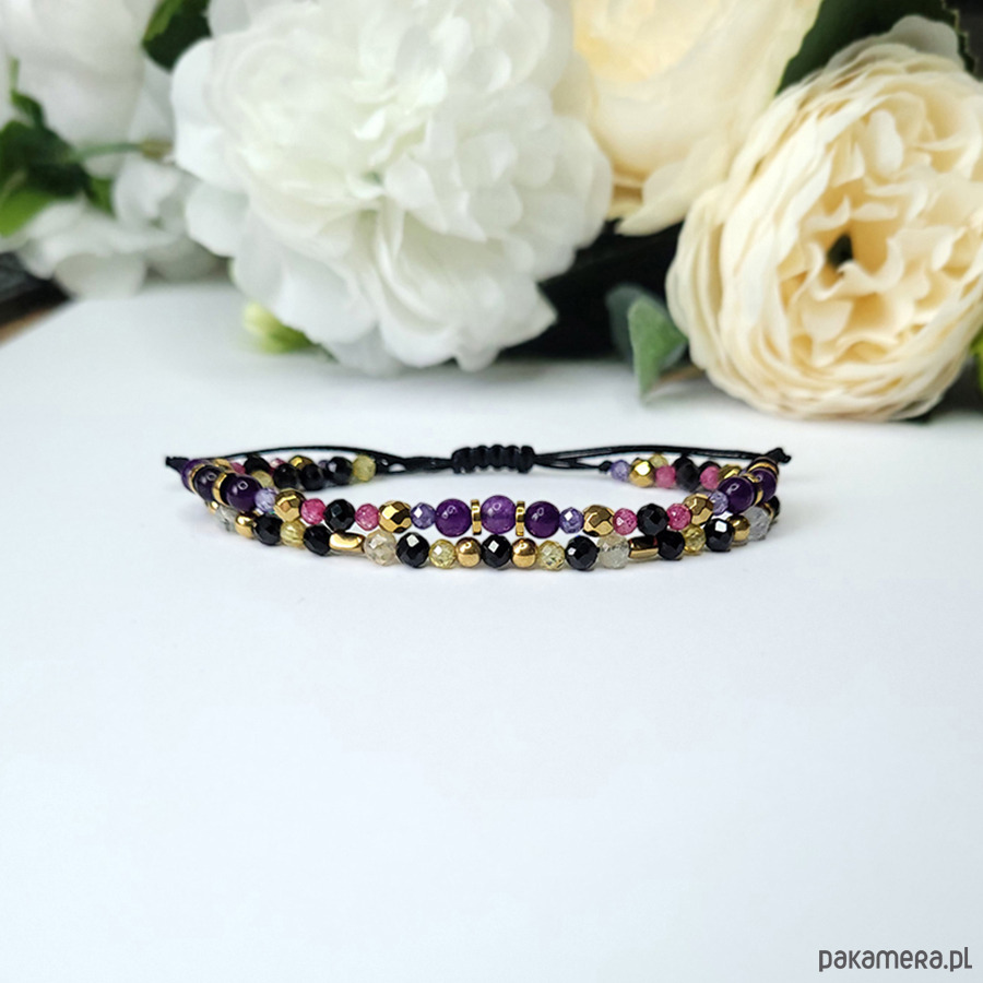 Piękna podwójna bransoletka zrobiona z kamieni naturalnych: Turmalinu, Ametystu, Cytrynu, Hematytu w kolorze złot a także Cyrkonii.