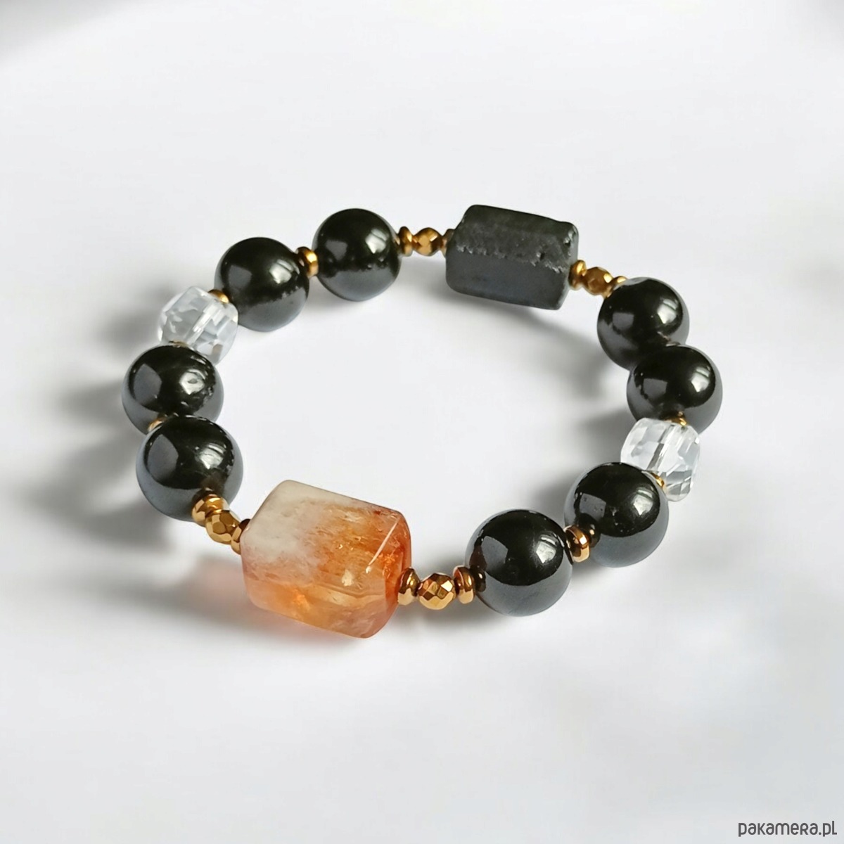 Bransoletka wykonana z wykonana z przepięknie wybarwionego cytrynu (prostopadłościan o obłych krawędziach ok.17x11mm), bardzo dużych kul czarnego turmalinu (ok.11-12mm), dużej bryłki surowego turmalinu (ok. 16x10mm), fasetowanych kostek kryształu górskiego i przekładek ze złotego hematytu.