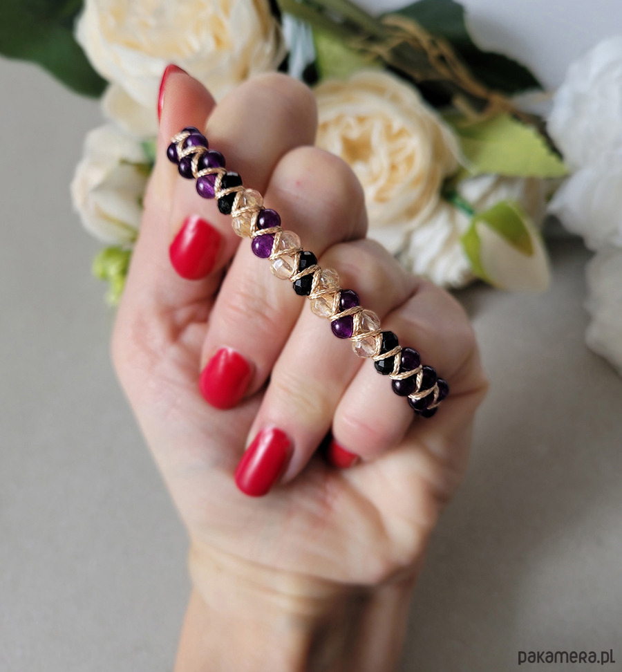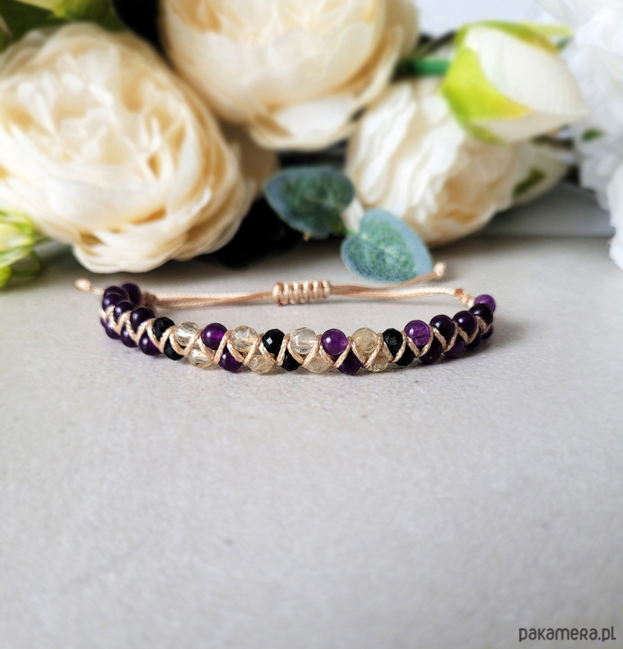 Bransoletka z podwójnym rzędem kamieni naturalnych: Turmalinem, Cytrynem oraz Ametystem.