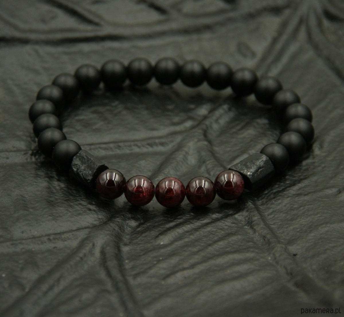 TUTAJ: niezwykle ciekawa bransoletka- talizman wykonana z matowego onyksu (8mm), granatu (8mm) -kolor bordowy, 2 bryłek surowego czarnego turmalinu.