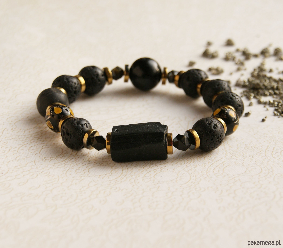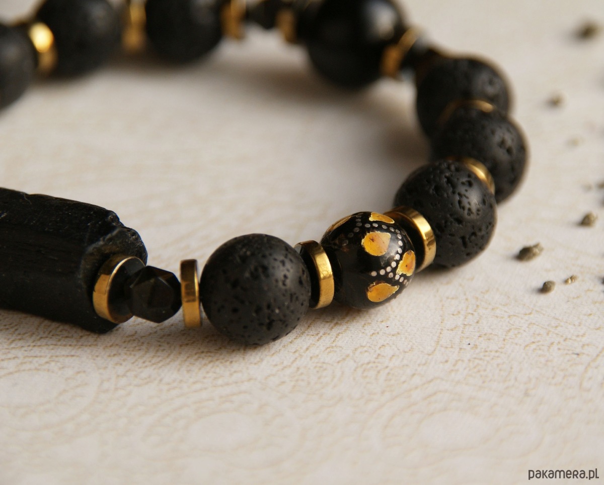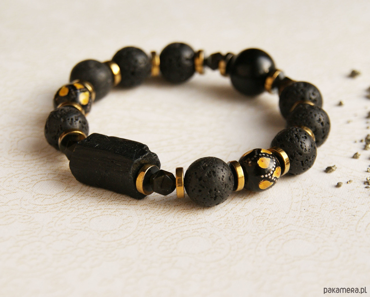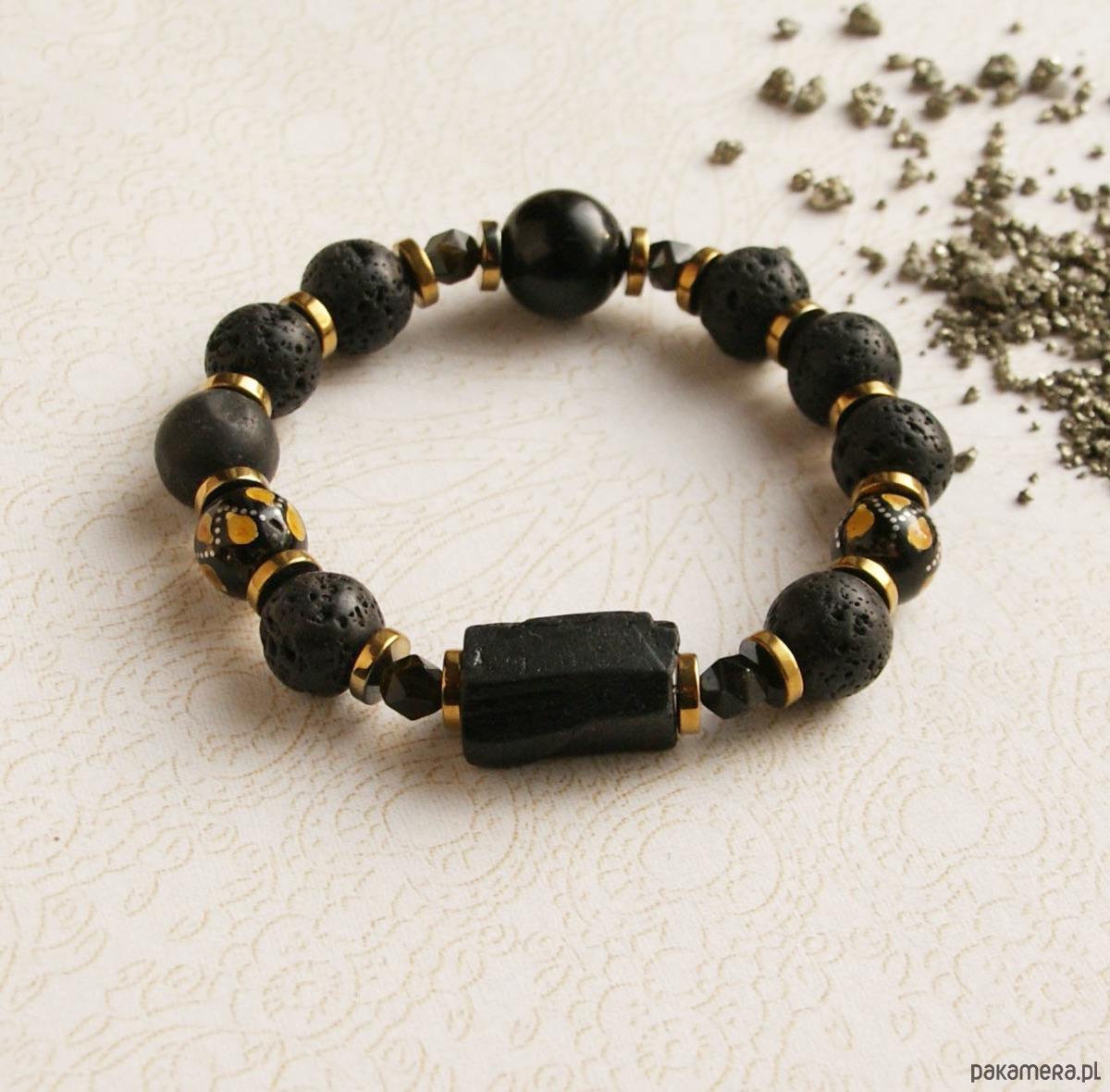 cudna, MASYWNA bransoleta wykonana z surowego czarnego turmalinu 20mm. kuli turmalinu 14mm, obsydianu złotego (szlif gwiazdkowy - 7mm), ręcznie robionych korali z inkrustowanym bursztynem (11mm), przekładek ze złotego hematytu. kamienie na solidnej gumce jubilerskiej (1mm).