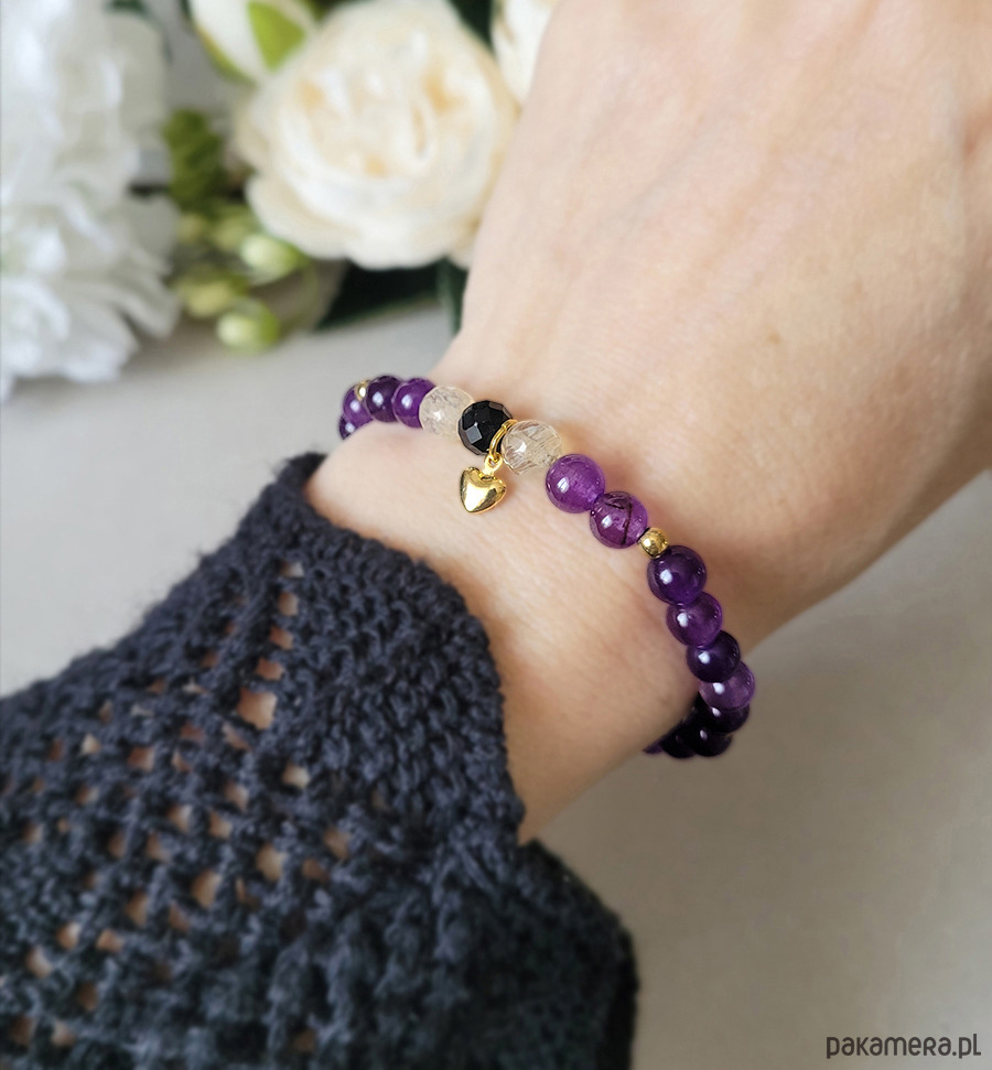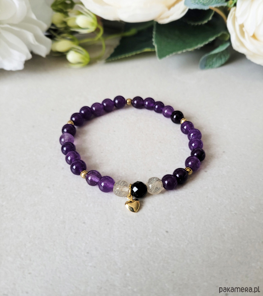 Śliczna bransoletka zrobiona z kamieni naturalnych: Turmalinu, Cytrynu, Ametystu oraz Hematytu z przywieszką sercem.