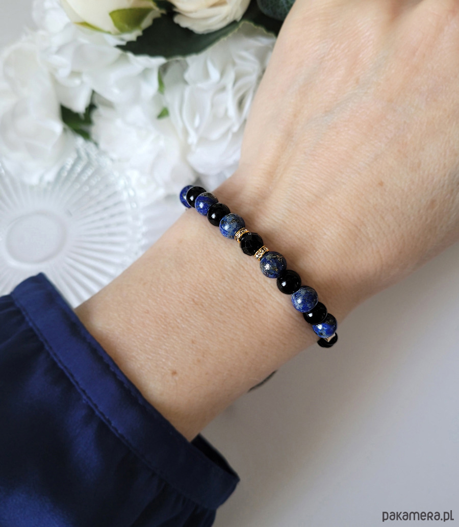 Przepiękna bransoletka z kolekcji "Queen of dark z turmalinem" zrobiona z kamieni naturalnych: Turmalinu, Onyksu, Lapisu lazuli oraz Hematytu w kolorze złota.