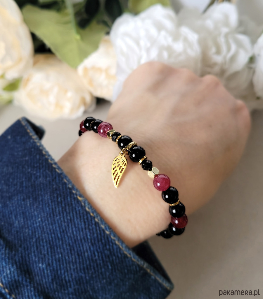 Bransoletka zrobiona z kamieni naturalnych: Turmalinu, Onyksu, Granatu oraz Hematytu.