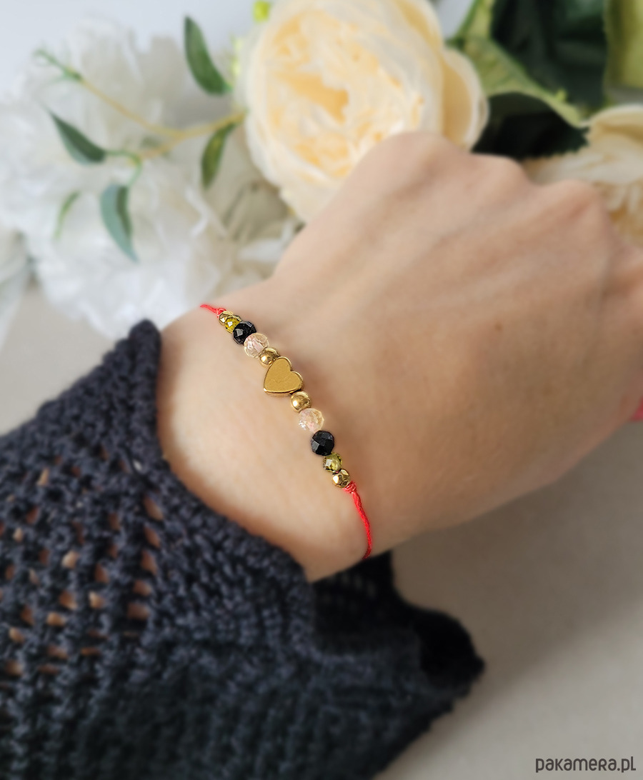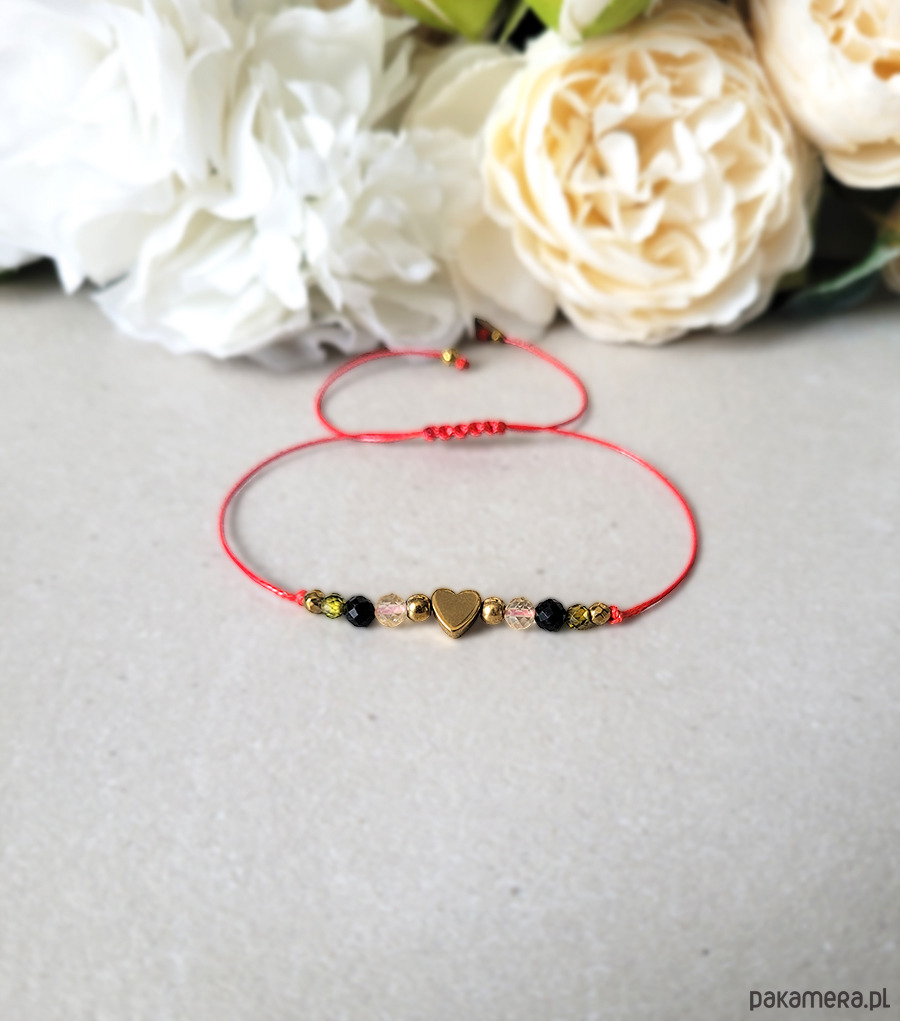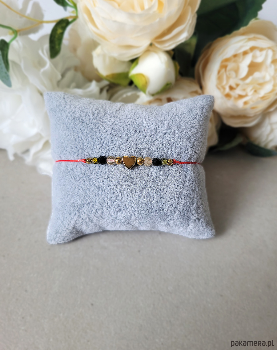 Delikatna minimalistyczna bransoletka zrobiona z kamieni naturalnych: Turmalinu czarnego, Cytrynu, Hematytu w kolorze złotym oraz Cyrkonii na czerwonym sznurku.