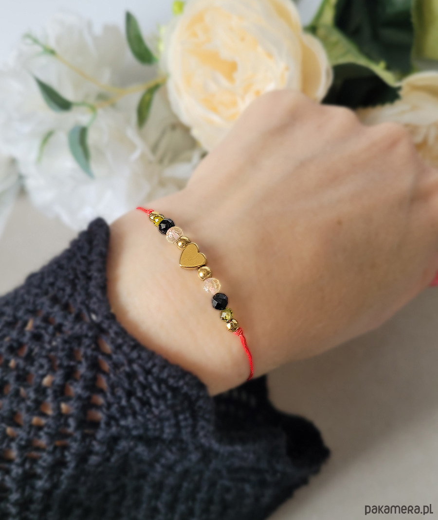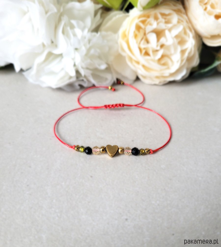 Delikatna minimalistyczna bransoletka zrobiona z kamieni naturalnych: Turmalinu czarnego, Cytrynu, Hematytu w kolorze złotym oraz Cyrkonii na czerwonym sznurku.