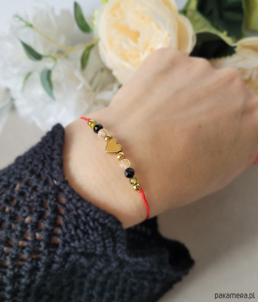 Delikatna minimalistyczna bransoletka zrobiona z kamieni naturalnych: Turmalinu czarnego, Cytrynu, Hematytu w kolorze złotym oraz Cyrkonii na czerwonym sznurku.