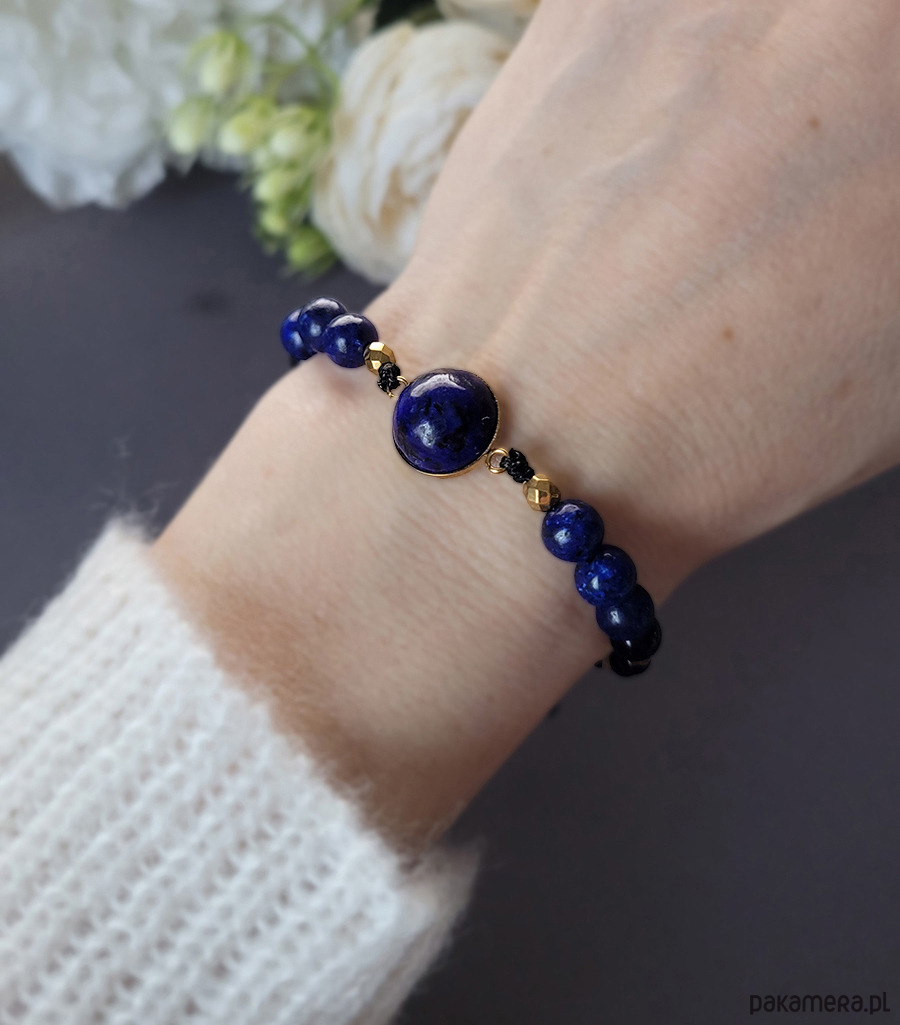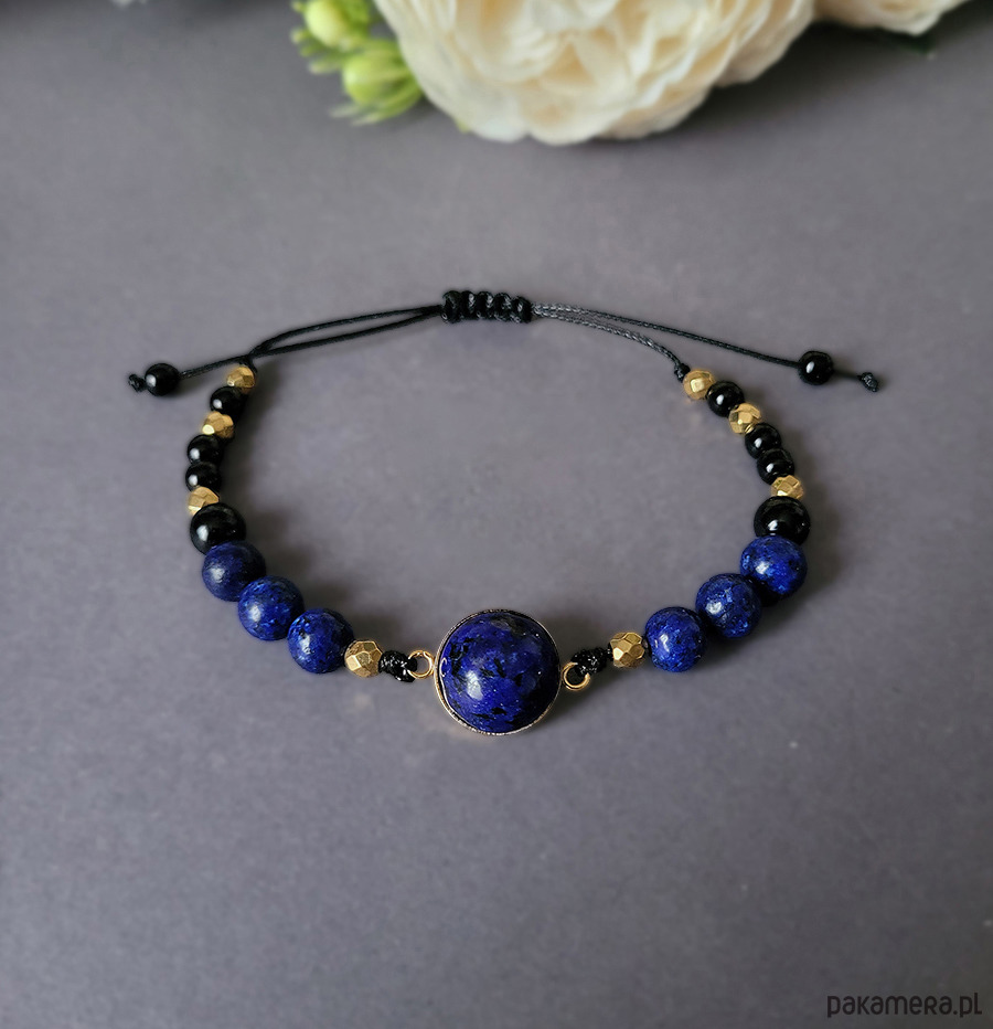 Piękna bransoletka zrobiona z kamieni naturalnych: Lapis Lazuli, Hematytu w kolorze złota, Obsydianu oraz Onyksu.