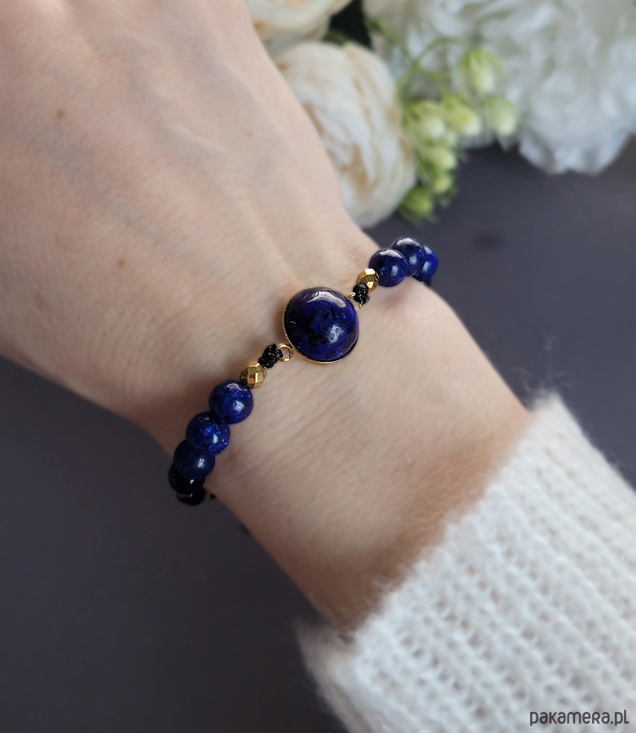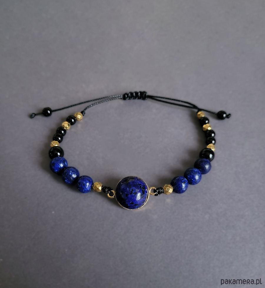 JEDYNA SZTUKA- Piękna bransoletka zrobiona z kamieni naturalnych: Lapis Lazuli, Hematytu w kolorze złota, Obsydianu oraz Onyksu.