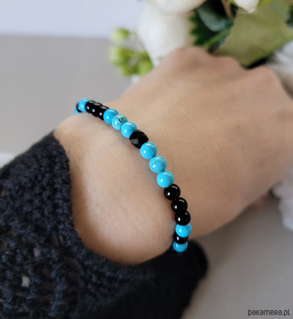 Przepiękna bransoletka zrobiona z kamieni naturalnych: Turmalinu, Turkusu oraz Onyksu.