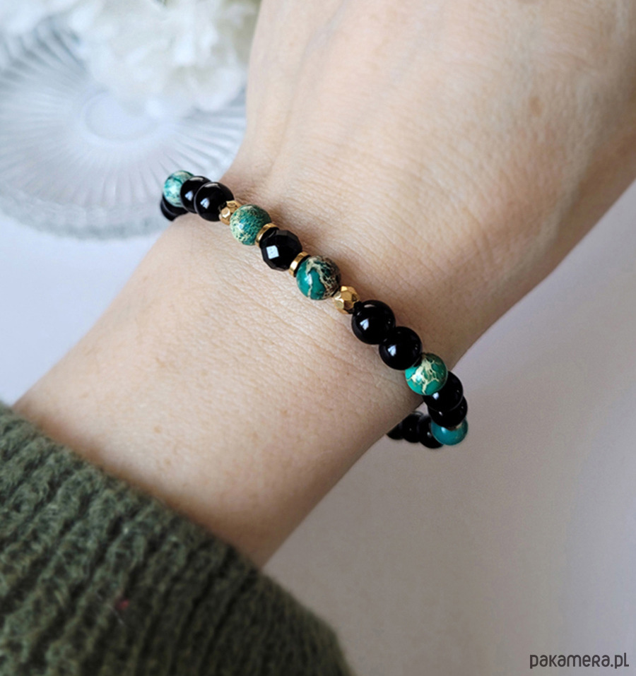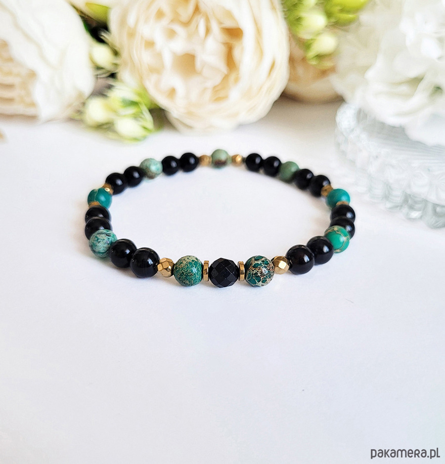Piękna elegancka bransoletka zrobiona z kamieni naturalnych: Turmalinu, Jaspisu Cesarskiego- fioletowego, Onyksu oraz Hematytu w kolorze złota.