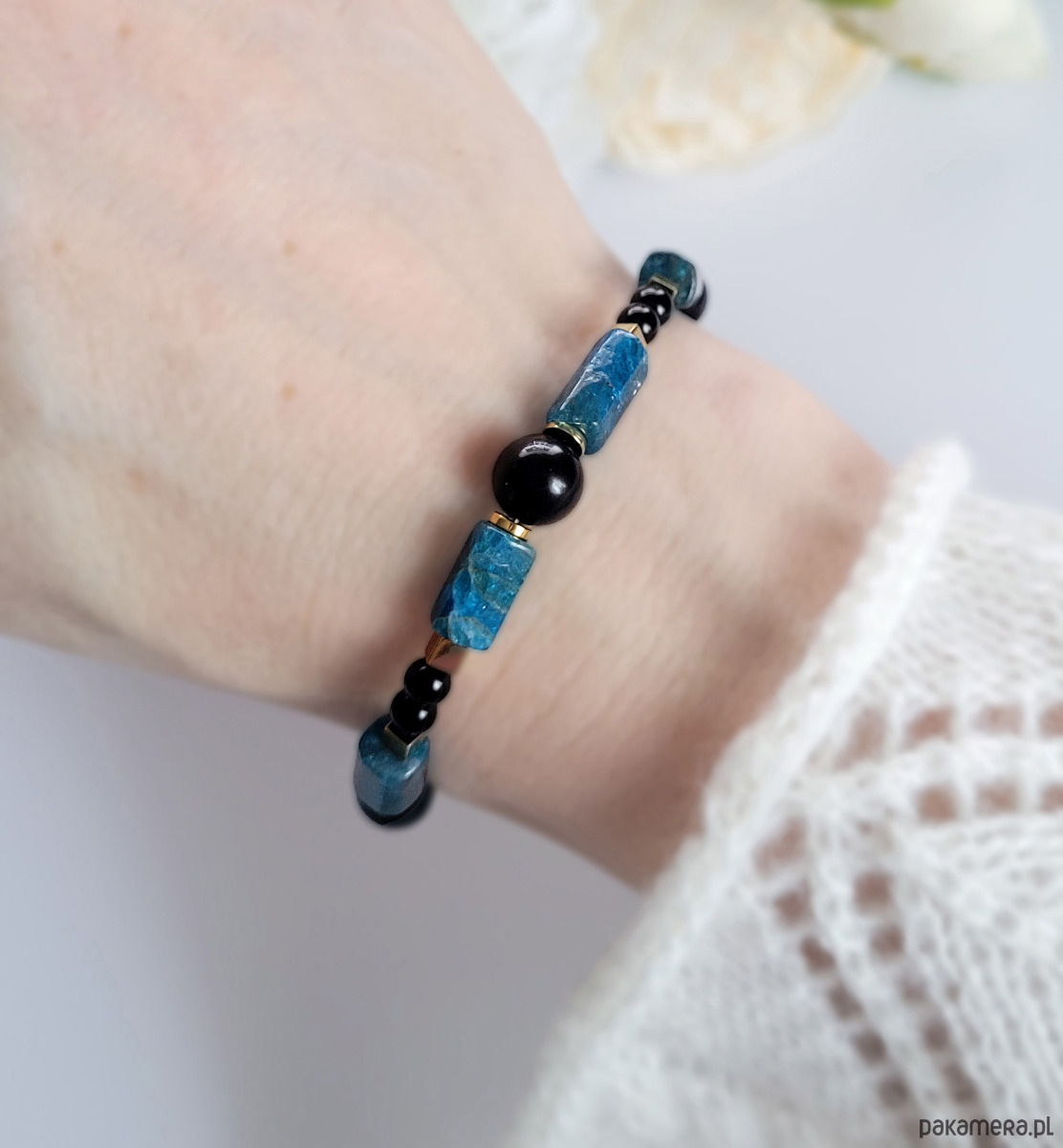 Piękna elegancka bransoletka zrobiona z kamieni naturalnych: Obsydianu, Onyksu, Apatytu oraz Hematytu w kolorze złota.