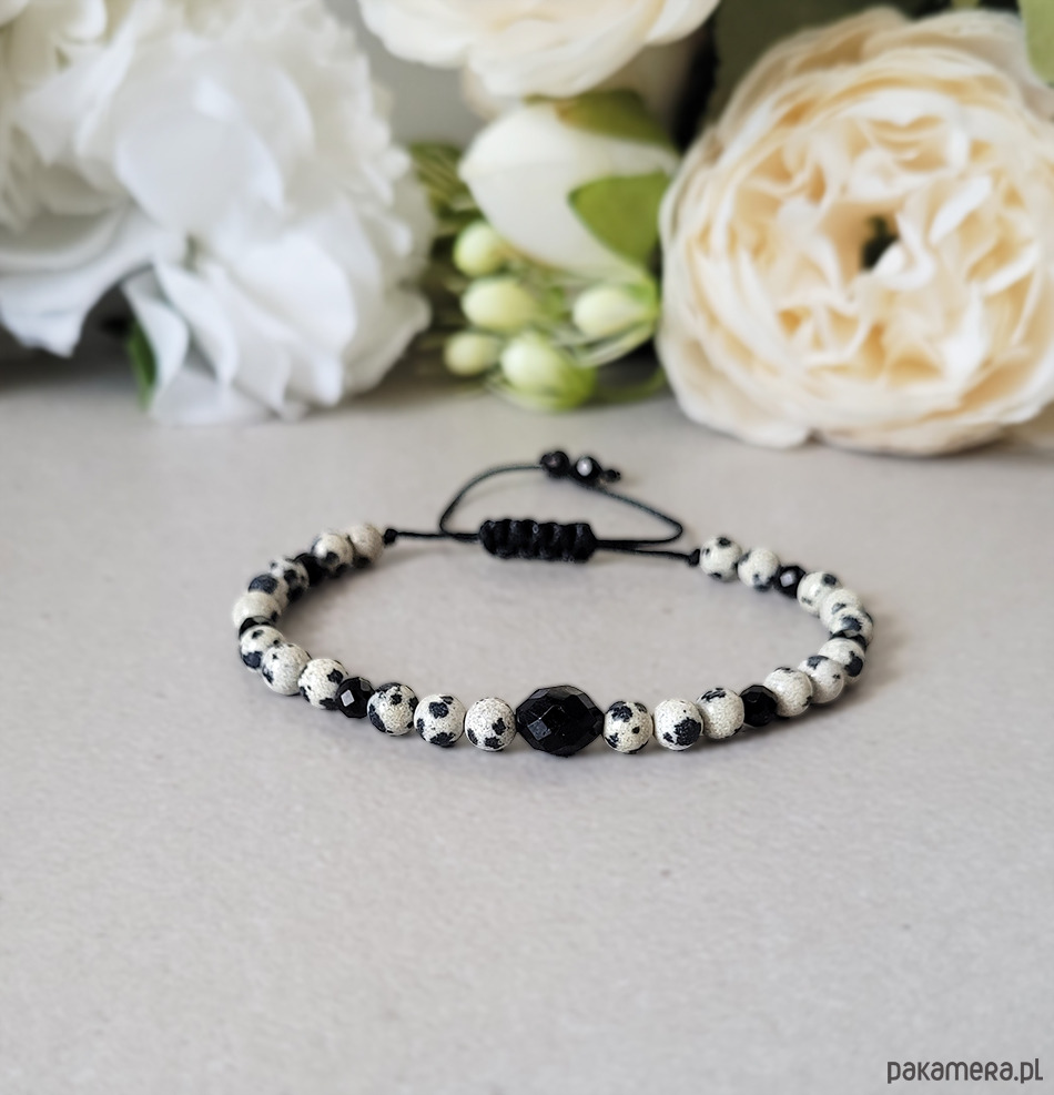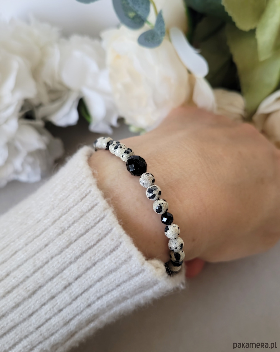 Bransoletka zrobiona z kamieni naturalnych: Jaspisu dalmatyńskiego oraz Turmalinu czarnego.