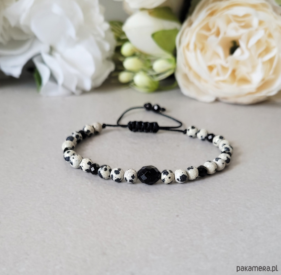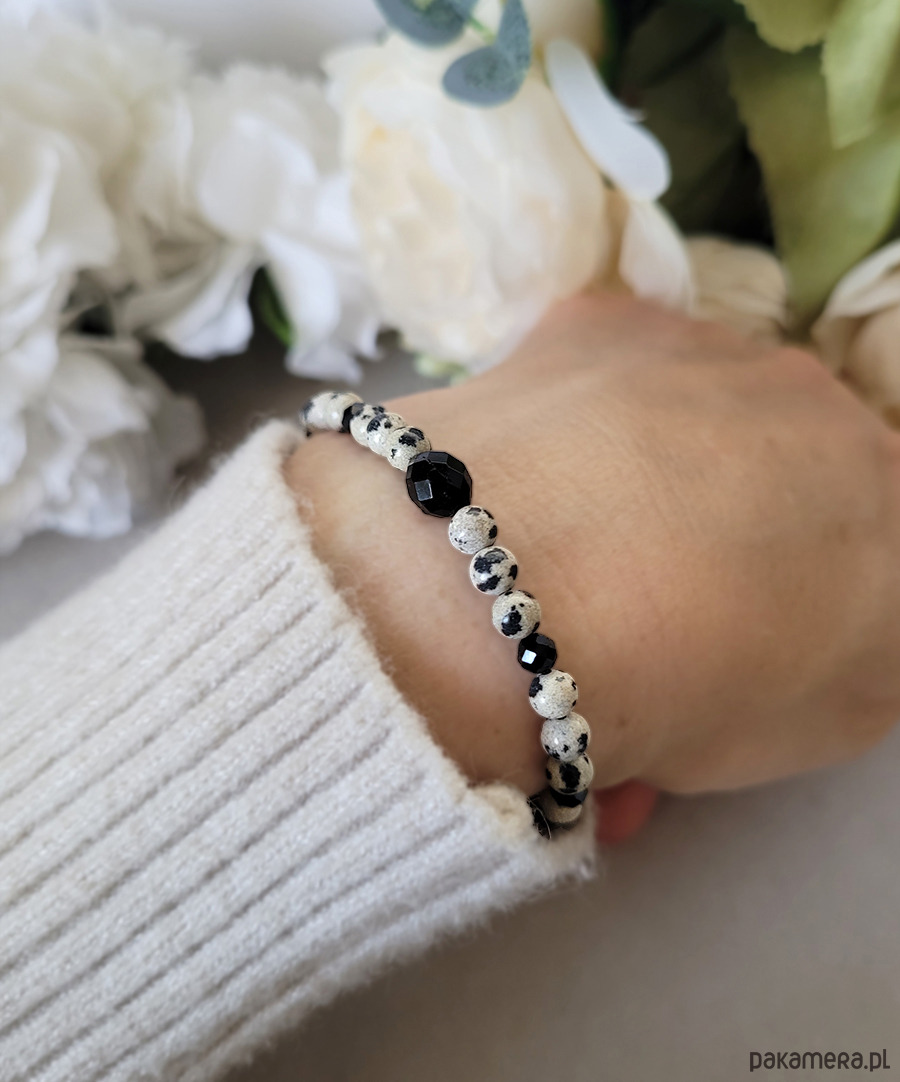 Bransoletka zrobiona z kamieni naturalnych: Jaspisu dalmatyńskiego oraz Turmalinu czarnego.