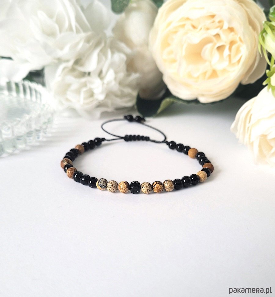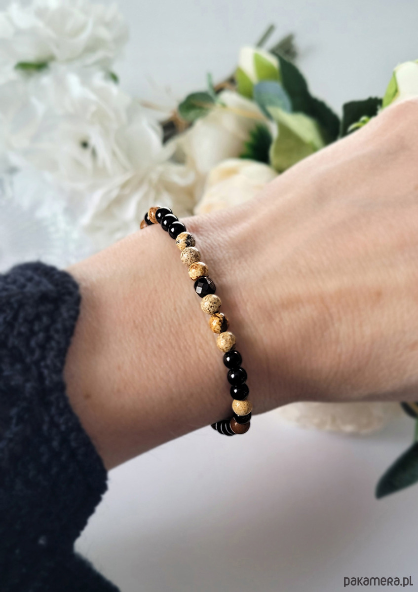 Przepiękna bransoletka zrobiona z kamieni naturalnych: Turmalinu, Jaspisu krajobrazowego oraz Onyksu.