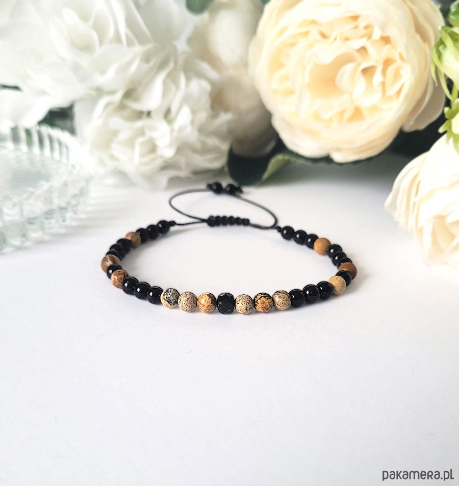 Przepiękna bransoletka zrobiona z kamieni naturalnych: Turmalinu, Jaspisu krajobrazowego oraz Onyksu.