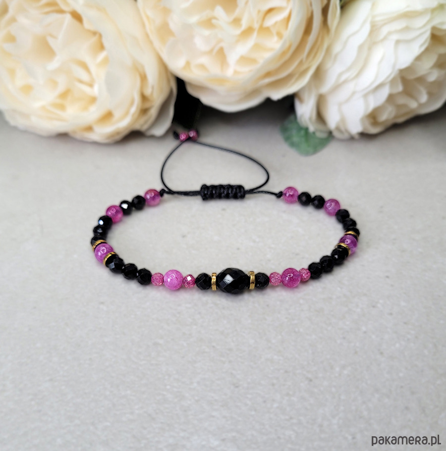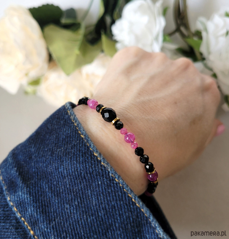 Bransoletka zrobiona z kamieni naturalnych: Turmalinu czarnego, Turmalinu różowego, Spinel, Hematytu oraz Cyrkonii.