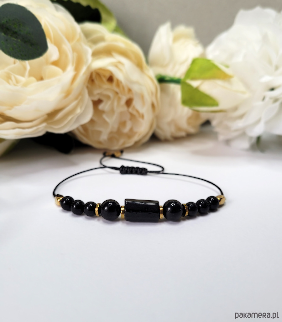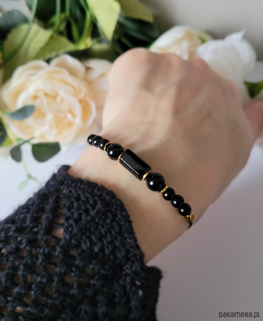 Piękna bransoletka zrobiona z kamieni naturalnych: Turmalinu, Onyksu oraz Hematytu.