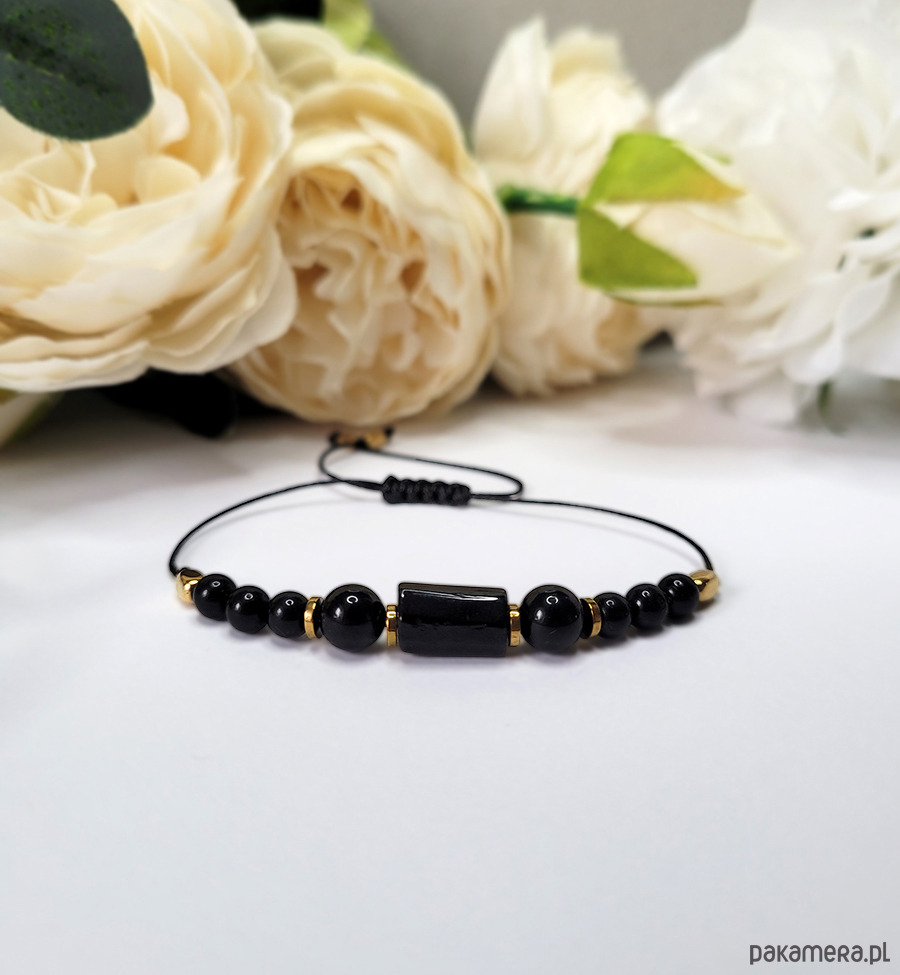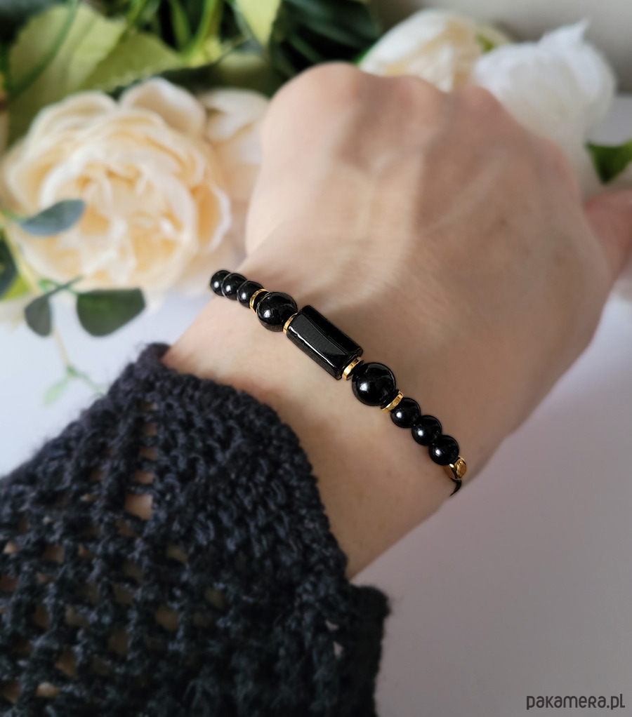 Piękna bransoletka zrobiona z kamieni naturalnych: Turmalinu, Onyksu oraz Hematytu.