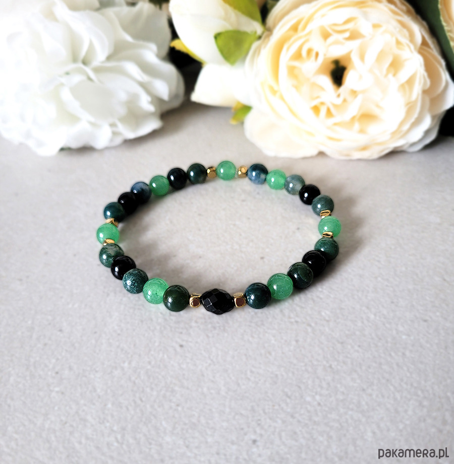 Bransoletka zrobiona z kamieni naturalnych: Turmalinu, Awenturynu, Onyksu, Agatu mszystego oraz Hematytu w kolorze złotym.