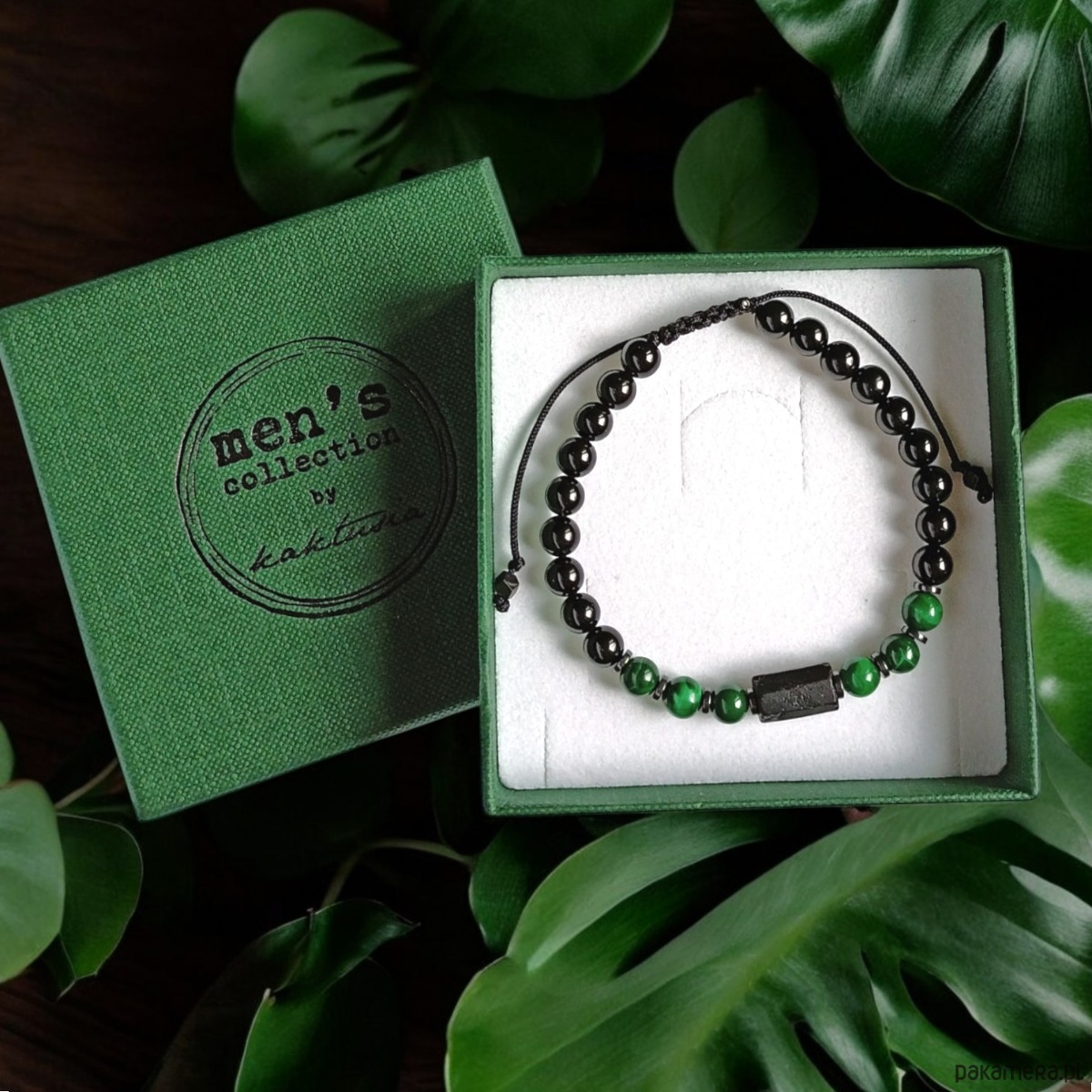 TUTAJ: bransoletka - wykonana z surowej bryłki czarnego turmalinu, kul malachitu błysk 6mm, kul turmalinu błysk 6mm, przekładek z hematytu.