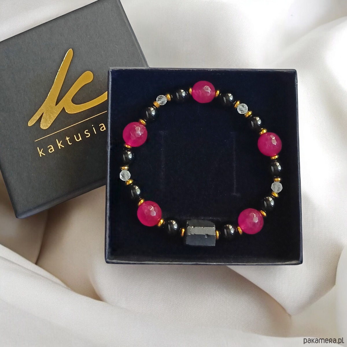 Piękna bransoletka na solidnej lince elastycznej, wykonana z surowej bryłki czarnego turmalinu, fasetowanych kul fuksjowego jadeitu 10mm, onyksu 8mm, fasetowanych kul kryształu górskiego 4mm oraz przekładek ze złotego hematytu.