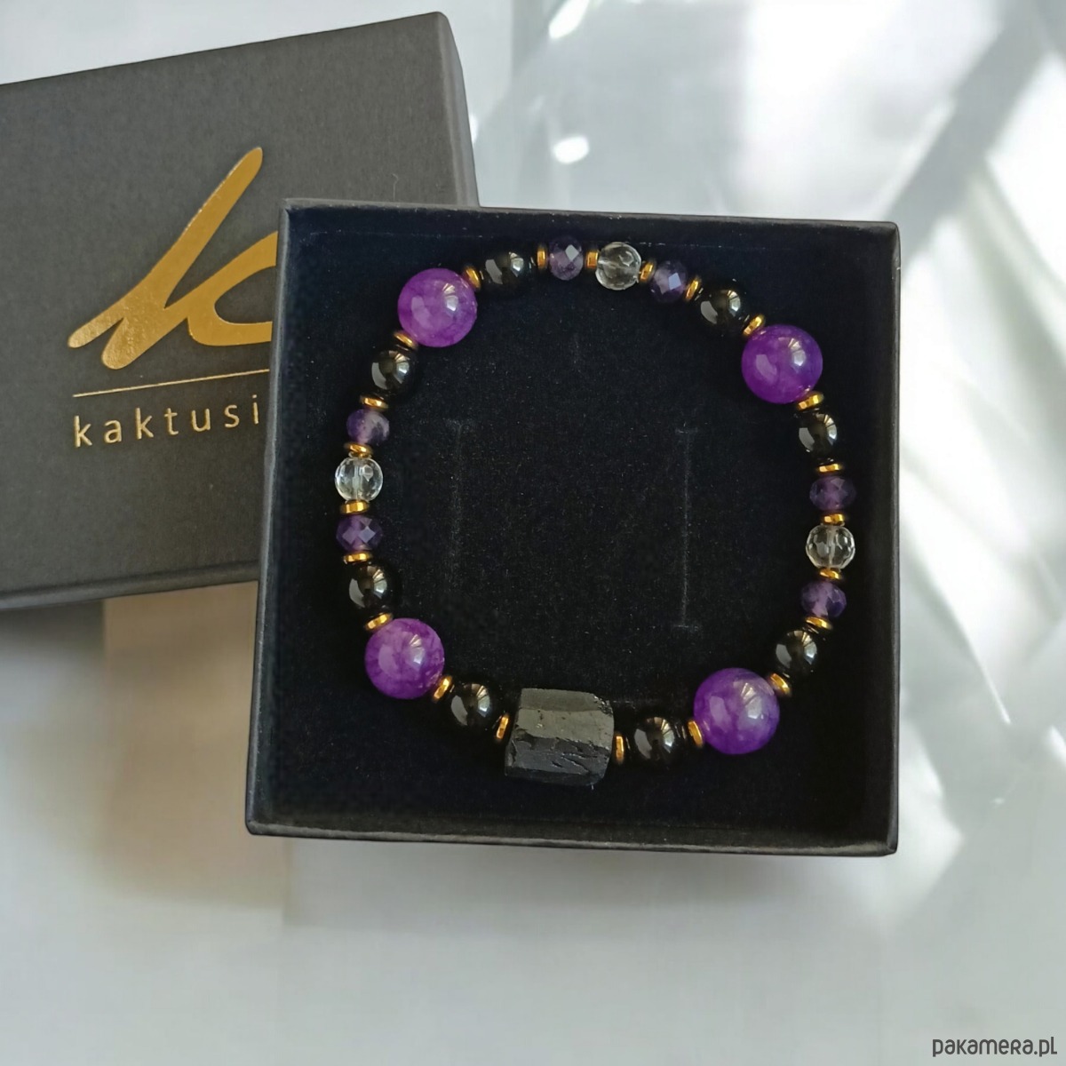 Piękna bransoletka na solidnej lince elastycznej, wykonana z surowej bryłki czarnego turmalinu, fasetowanych oponek ametystu, kul fioletowego agatu 10mm, onyksu 8mm, fasetowanych kul kryształu górskiego 6mm oraz przekładek ze złotego hematytu.