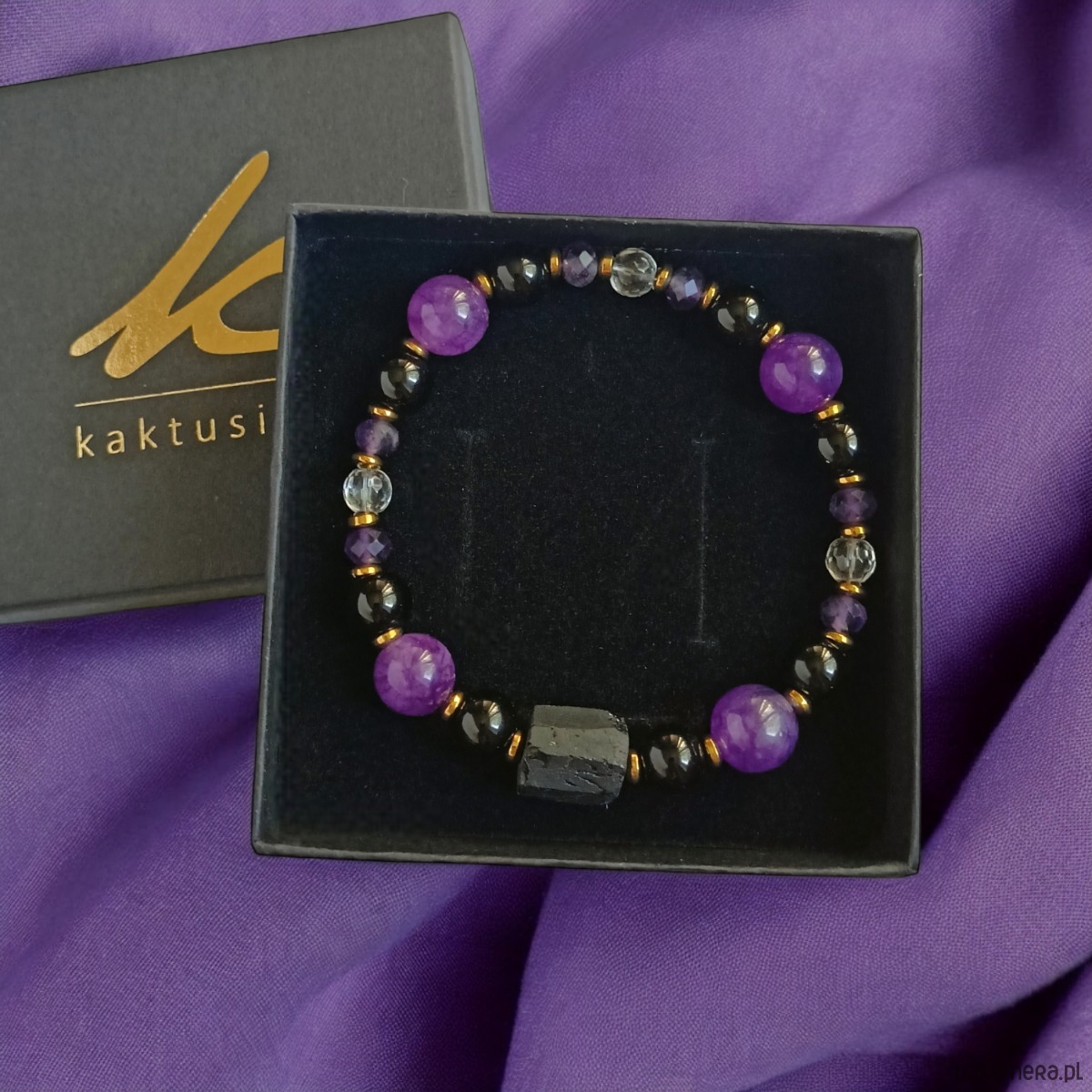 Piękna bransoletka na solidnej lince elastycznej, wykonana z surowej bryłki czarnego turmalinu, fasetowanych oponek ametystu, kul fioletowego agatu 10mm, onyksu 8mm, fasetowanych kul kryształu górskiego 6mm oraz przekładek ze złotego hematytu.