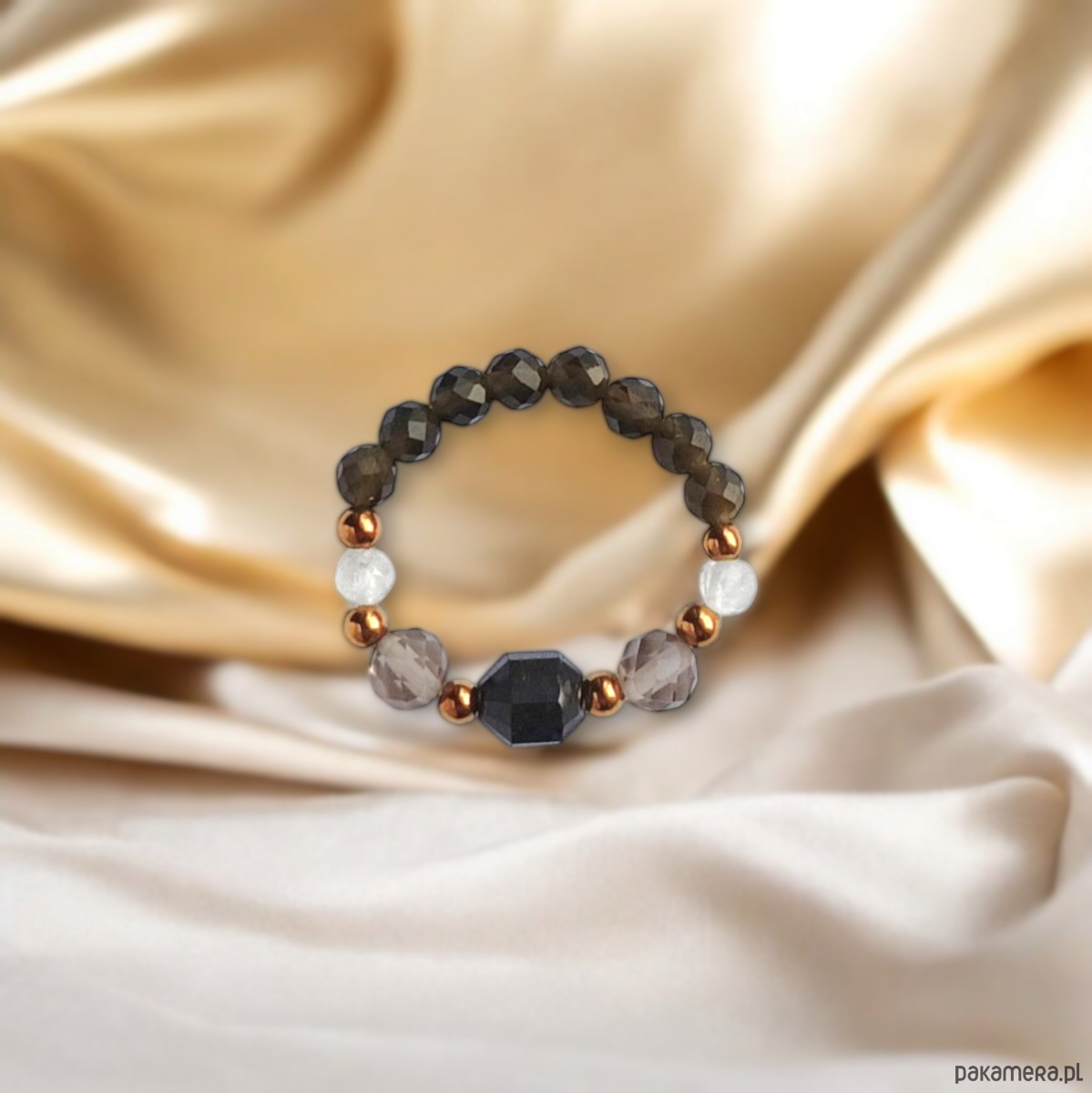 OCHRONA : pierścionek II - turmalin, obsydian, kwarc dymny, kryształ górski