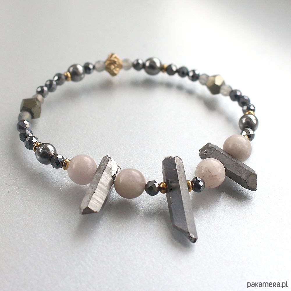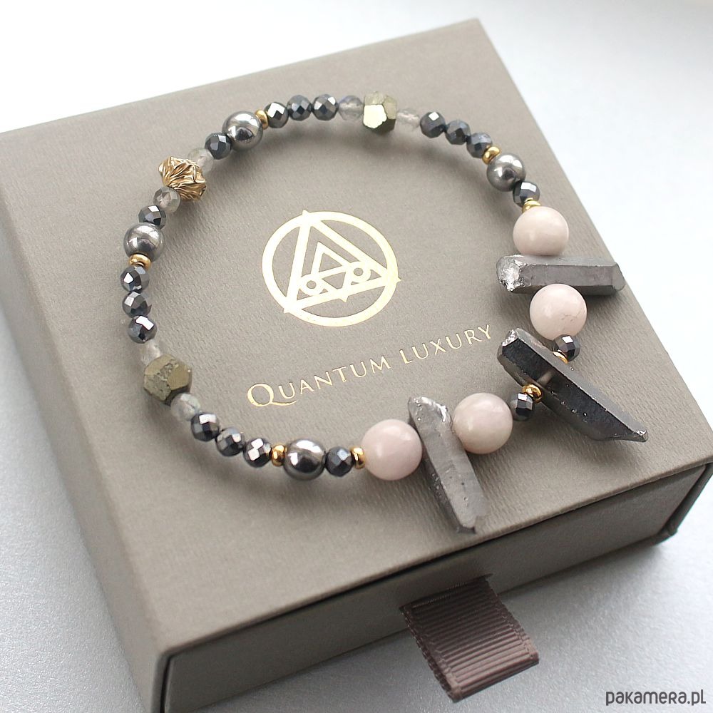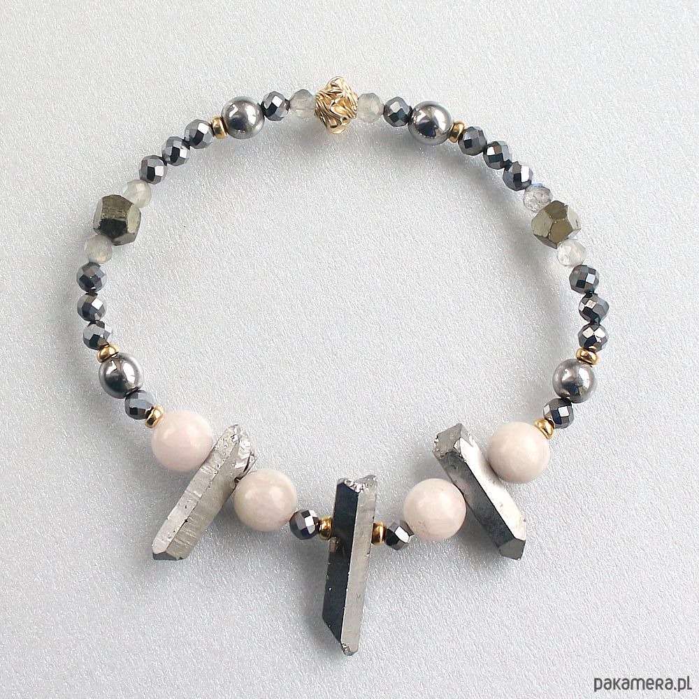 Energetyczna bransoletka mocy wykonana ręcznie z kwarcem tytanowym, naturalnymi kunzytami, teraherzem, pirytem, labradorytem i hematytem. Ozdobiona przekładkami wykonanymi ze złota gold filled 14k.