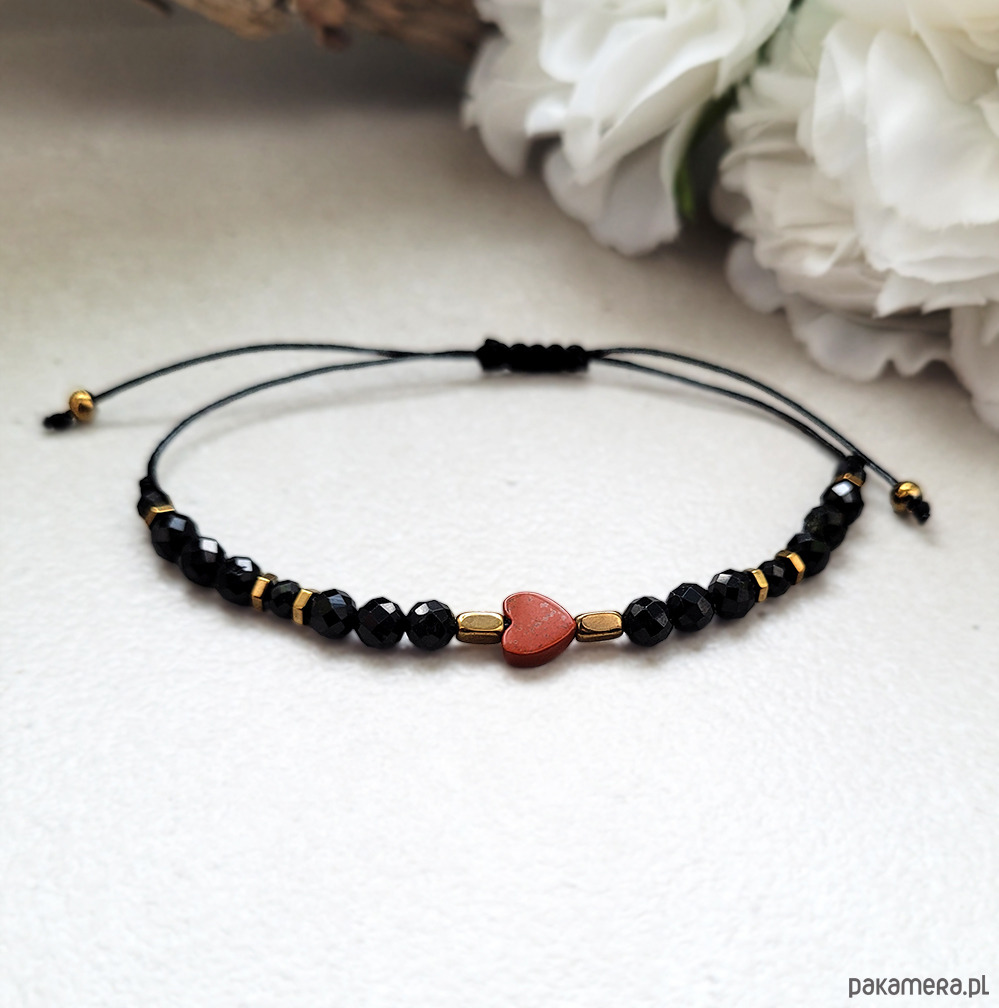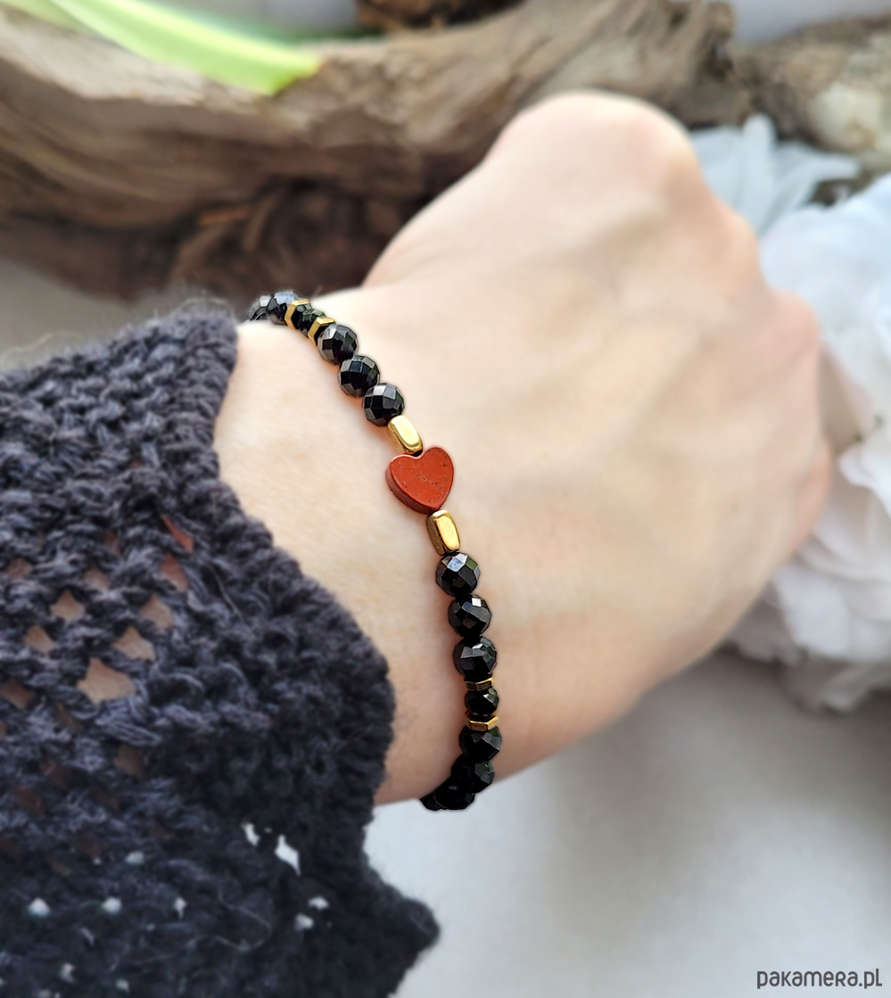 Przepiękna delikatna bransoletka zrobiona z kamieni naturalnych: Turmalinu, Spinelu, Jaspisu czerwonego oraz Hematytu w kolorze złota.