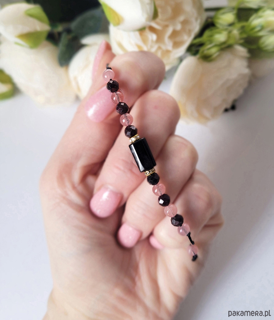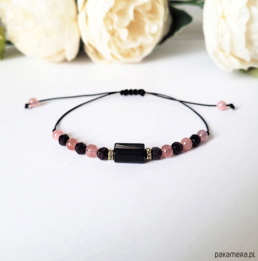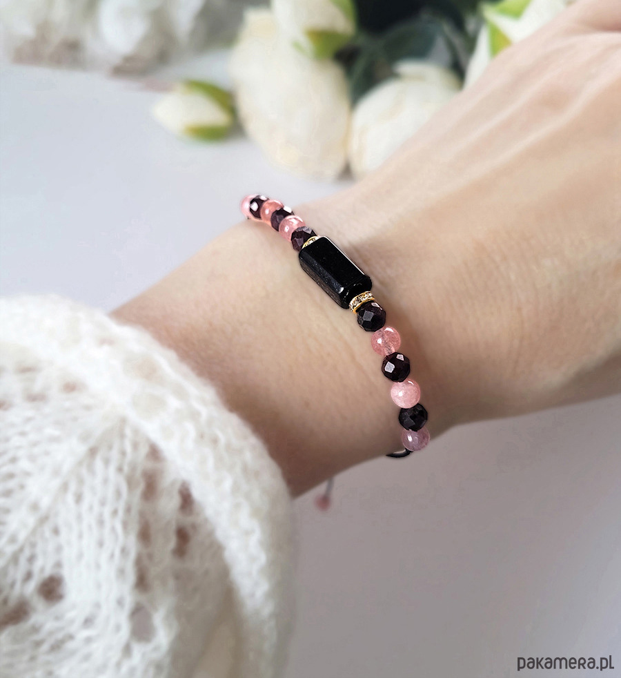 Elegancka bransoletka zrobiona z kamieni naturalnych: Turmalinu, ciemno bordowego Granatu, Opalu różowego.