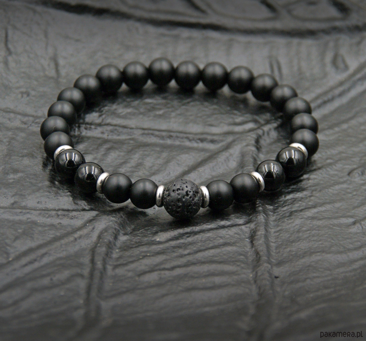 niezwykle ciekawa bransoletka- talizman wykonana z matowego onyksu (8mm), czarnego turmalinu (połysk, 8mm), kuli porowatej lawy wulkanicznej (10mm) , przekładek ze stali szlachetnej (nie uczula, kolor nie ściera się)