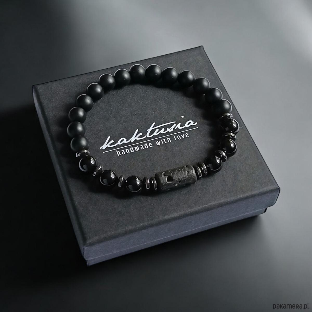 niezwykle ciekawa bransoletka- talizman wykonana z matowego onyksu (8mm), czarnego turmalinu (połysk, 8mm), elementu z porowatej lawy wulkanicznej (ok.16mm) , przekładek z grafitowego hematytu.