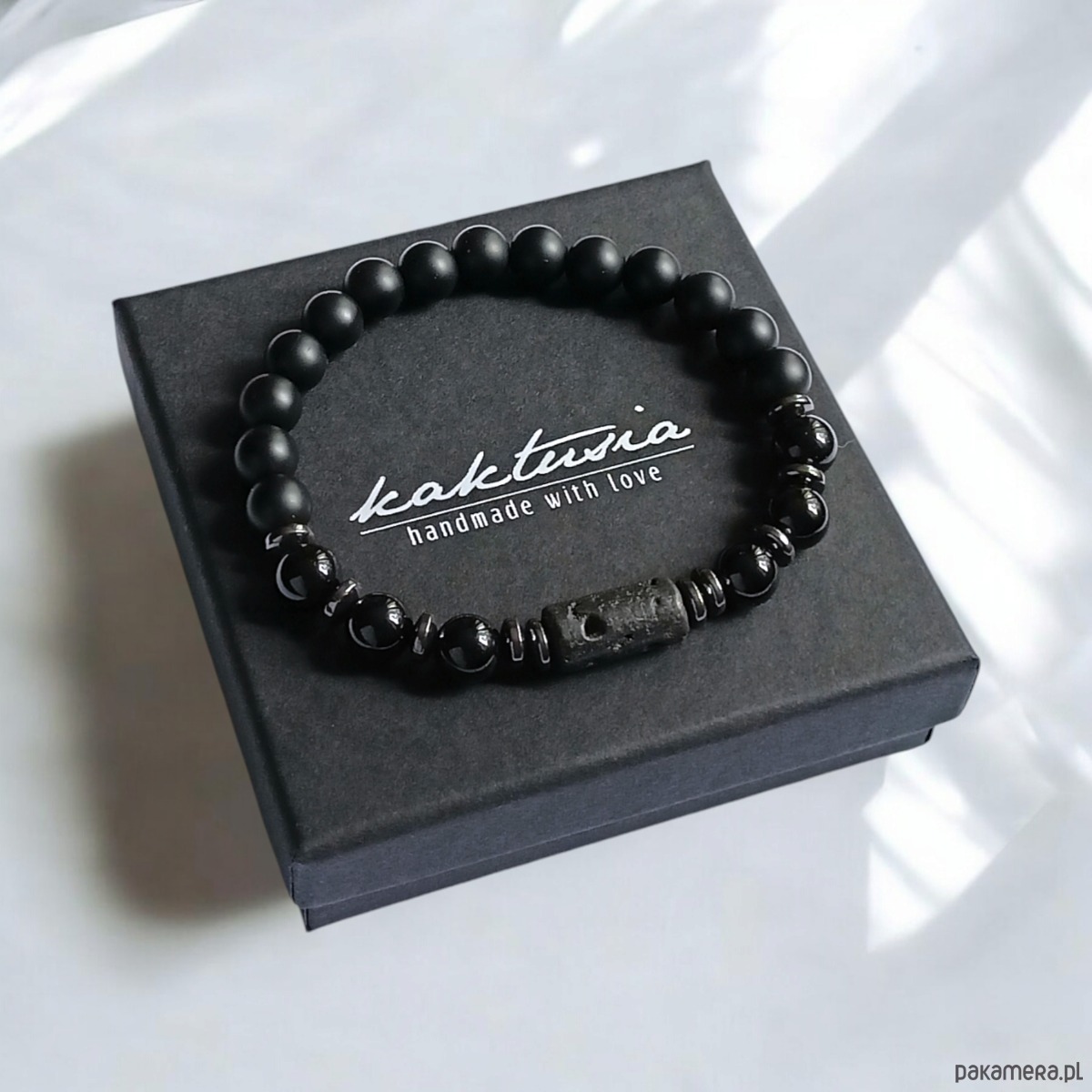 niezwykle ciekawa bransoletka- talizman wykonana z matowego onyksu (8mm), czarnego turmalinu (połysk, 8mm), elementu z porowatej lawy wulkanicznej (ok.16mm) , przekładek z grafitowego hematytu.