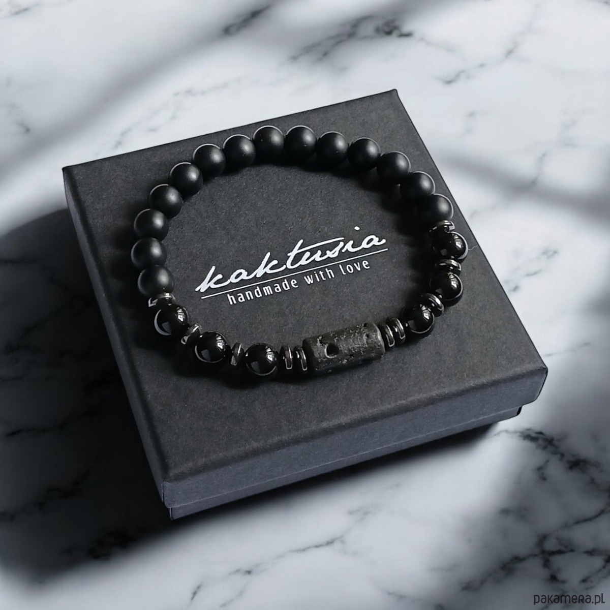 niezwykle ciekawa bransoletka- talizman wykonana z matowego onyksu (8mm), czarnego turmalinu (połysk, 8mm), elementu z porowatej lawy wulkanicznej (ok.16mm) , przekładek z grafitowego hematytu.