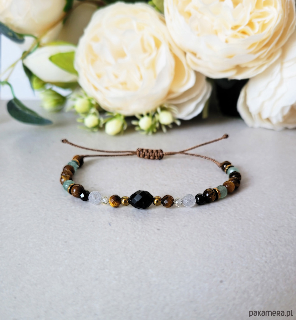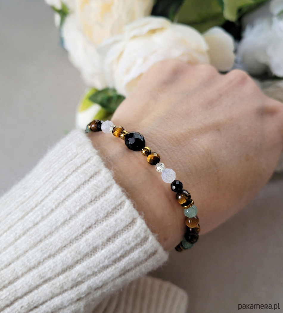 Przepiękna bransoletka zrobiona z kamieni naturalnych: Turmalinu, Tygrysiego oka, Kamienia księżycowego, Awenturynu, Hematytu w kol złota oraz Cyrkonii.