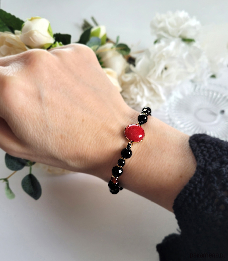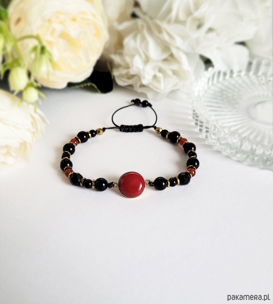 Czarna elegancka bransoletka zrobiona z kamieni naturalnych: Turmalinu fasetowanego, Onyksu, Jedeitu, Agatu karneolowego oraz Hematytu.
