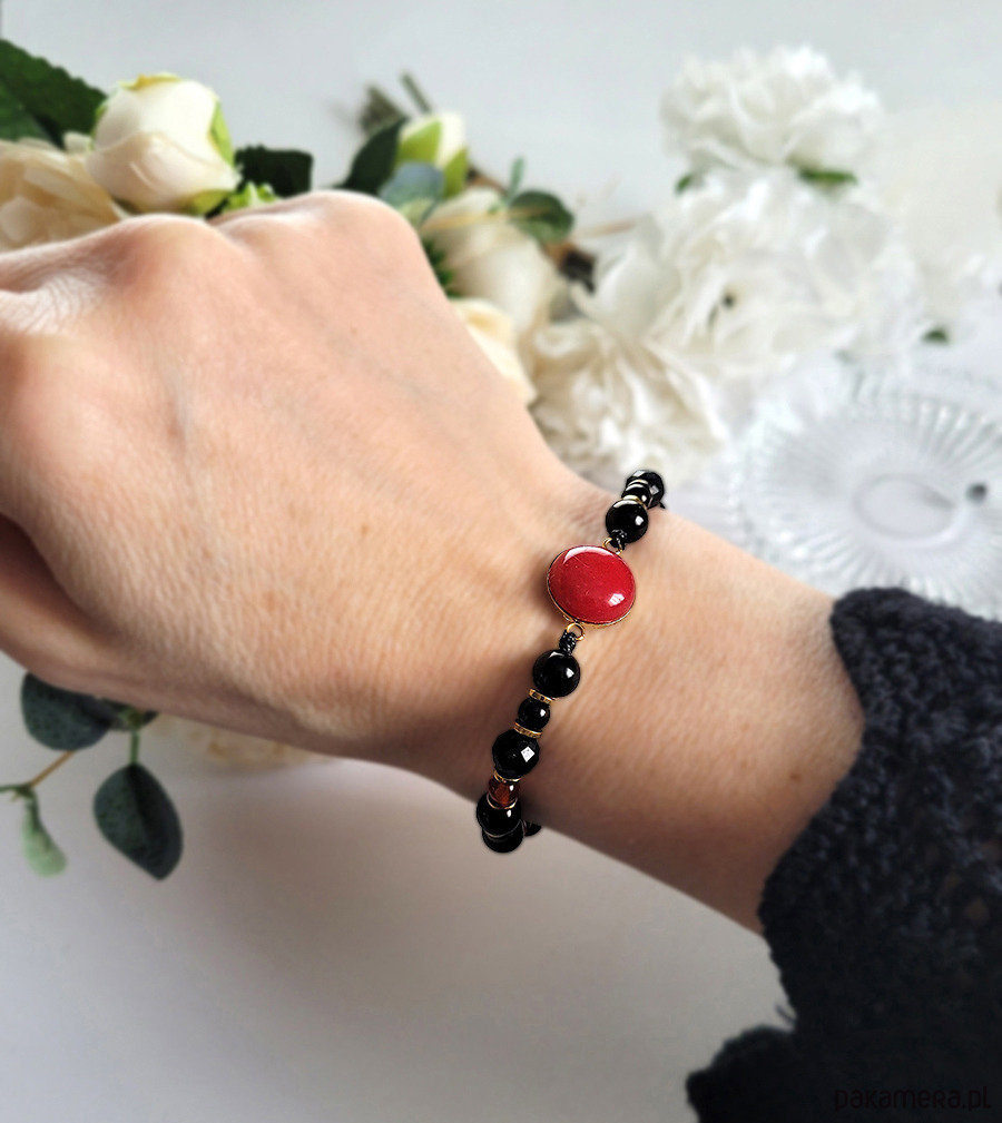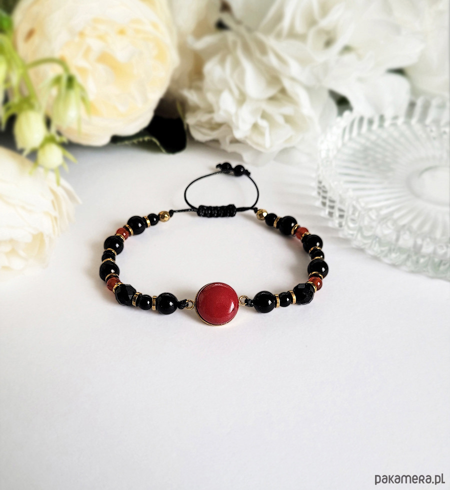 Czarna elegancka bransoletka zrobiona z kamieni naturalnych: Turmalinu fasetowanego, Onyksu, Jedeitu, Agatu karneolowego oraz Hematytu.