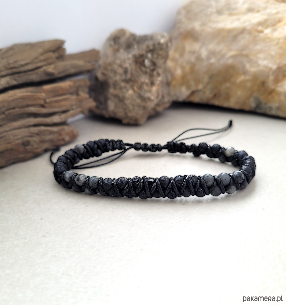 Męska bransoletka zrobiona z kamieni naturalnych: Turmalin, Labradorytu oraz Lawy.