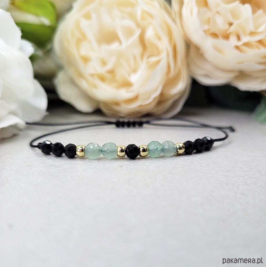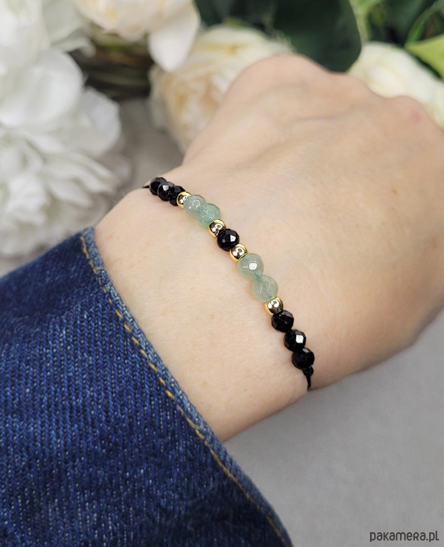 Przepiękna delikatna bransoletka zrobiona z kamieni naturalnych: Turmalinu, Awenturynu, Spinelu i Hematytu w kolorze złota.