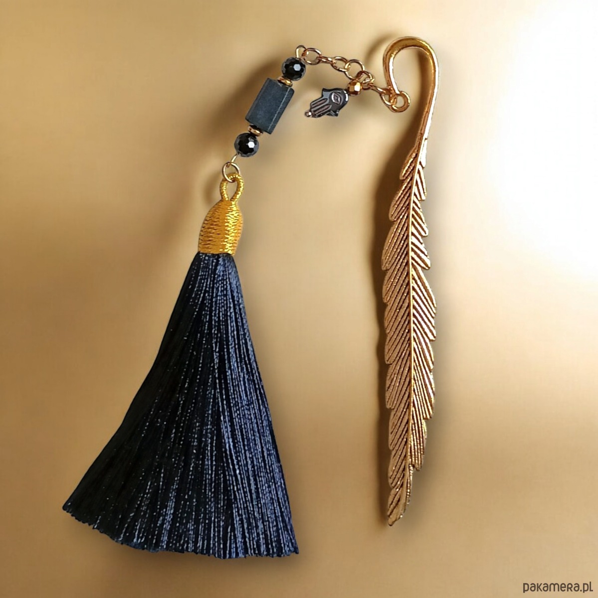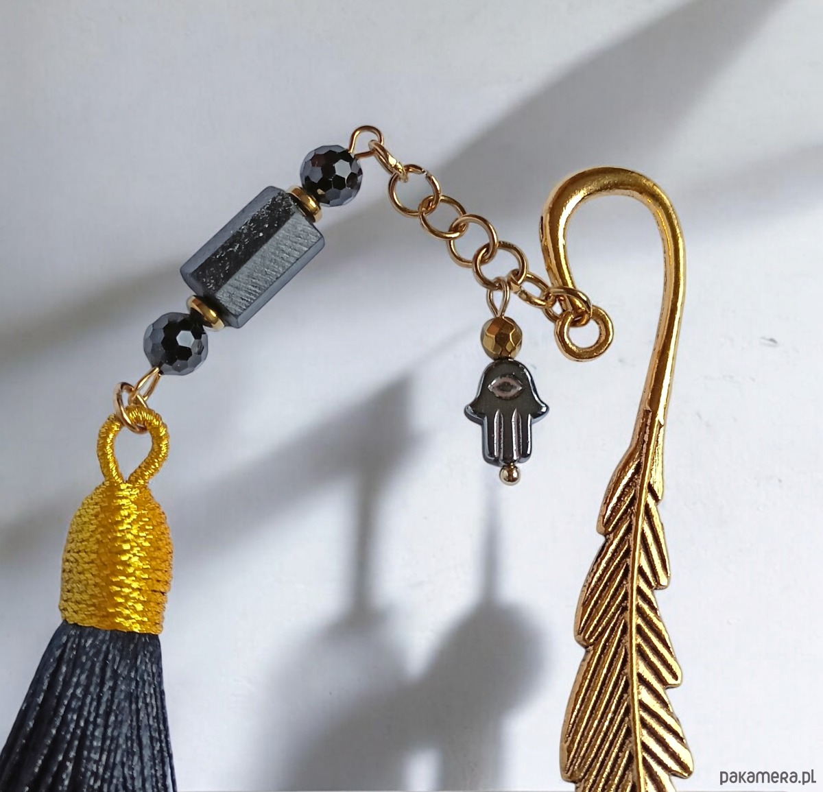 Czarny turmalin (najsilniejszy kamień ochronny) - w dwóch postaciach: surowa bryłka (ok.11mm) i fasetowane kule 6mm, okazały chwost w kolorze czarnym, dodatkowo: zawieszka HAMSA (talizman chroniący od zła) wykonana z rzeźbionego grafitowego hematytu. przekładki: hematyt złoty. baza zakładki - metal w kolorze złota. pozostałe elementy metalowe wykonane z pozłacanej stali szlachetnej. wszystkie poszczególne elementy są ruchome, więc zakładka będzie się ładnie układała. długość samej zakładki (bazy): ok.12cm. .. dł. całego elementu wiszącego: ok.17cm.