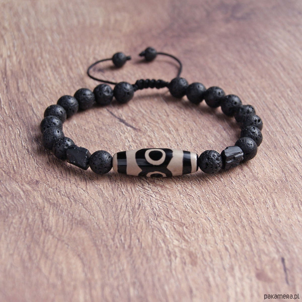 TUTAJ: niezwykle okazała bransoleta męska NA SOLIDNYM SZNURECZKU NYLONOWYM wykonana z kul porowatej lawy wulkanicznej (8mm); oraz 2 bryłek czarnego, surowego turmalinu i elementu z agatu tybetańskiego (ok. 30mm).