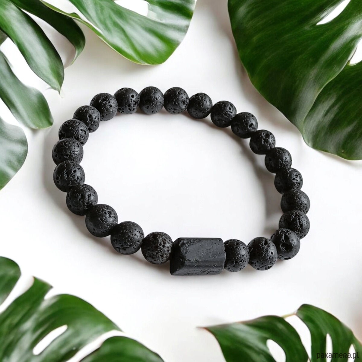 wykonana z czarnego turmalinu (bryłka surowa,ciosana) oraz porowatej lawy wulkanicznej (8mm)